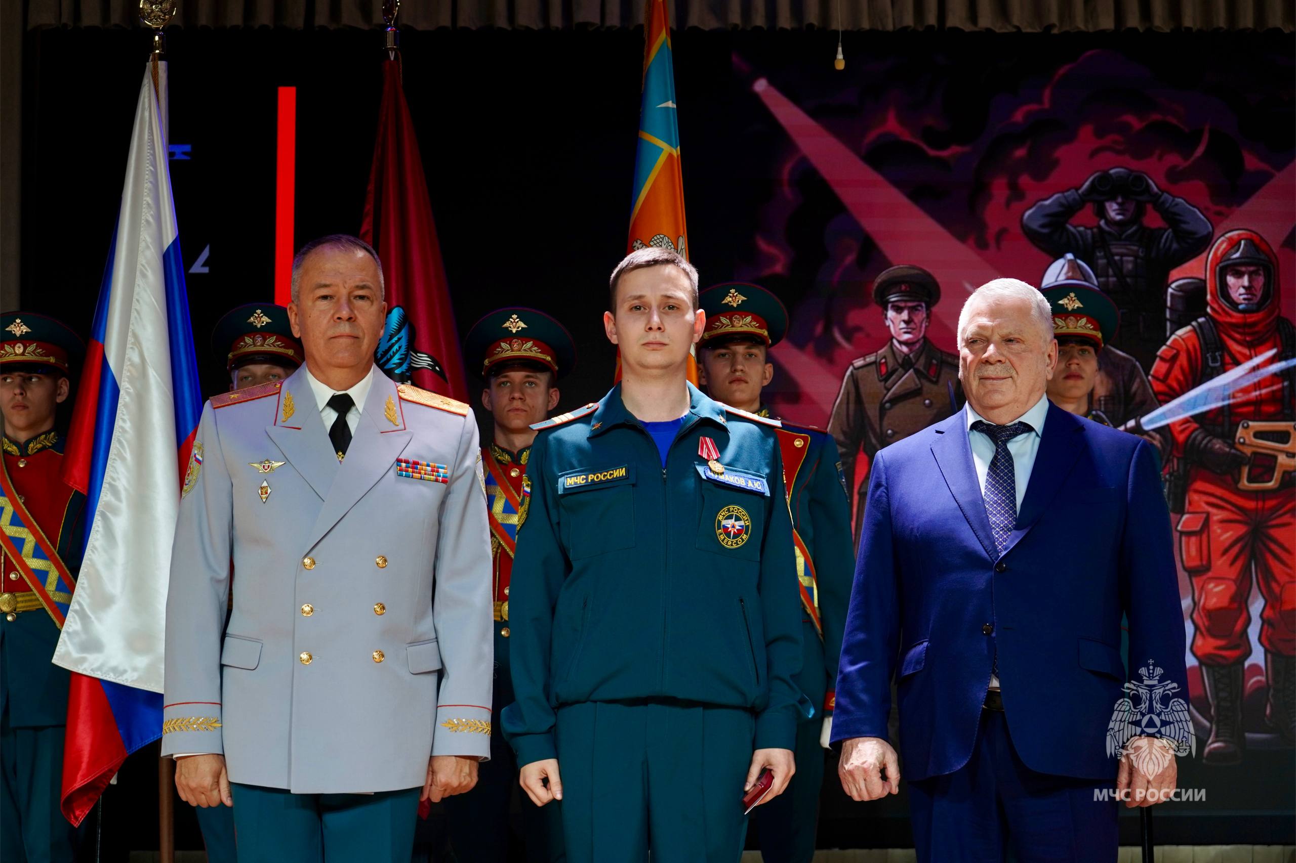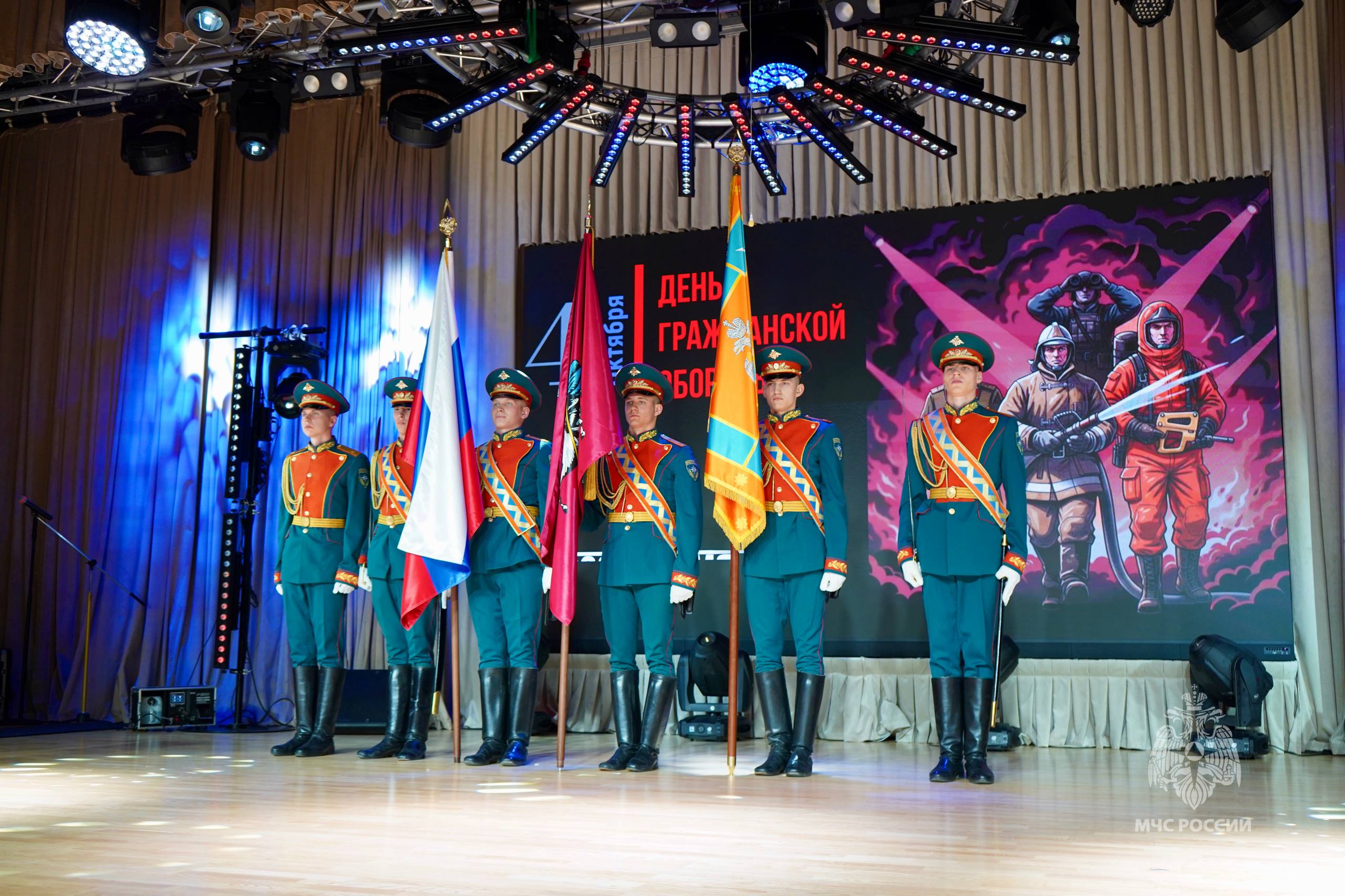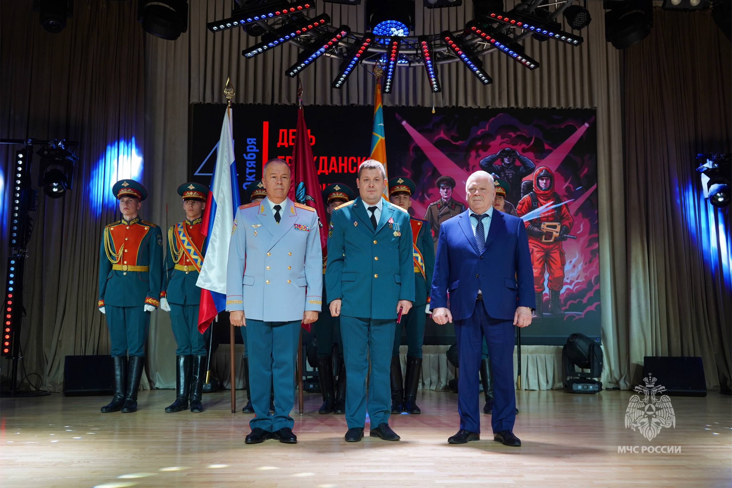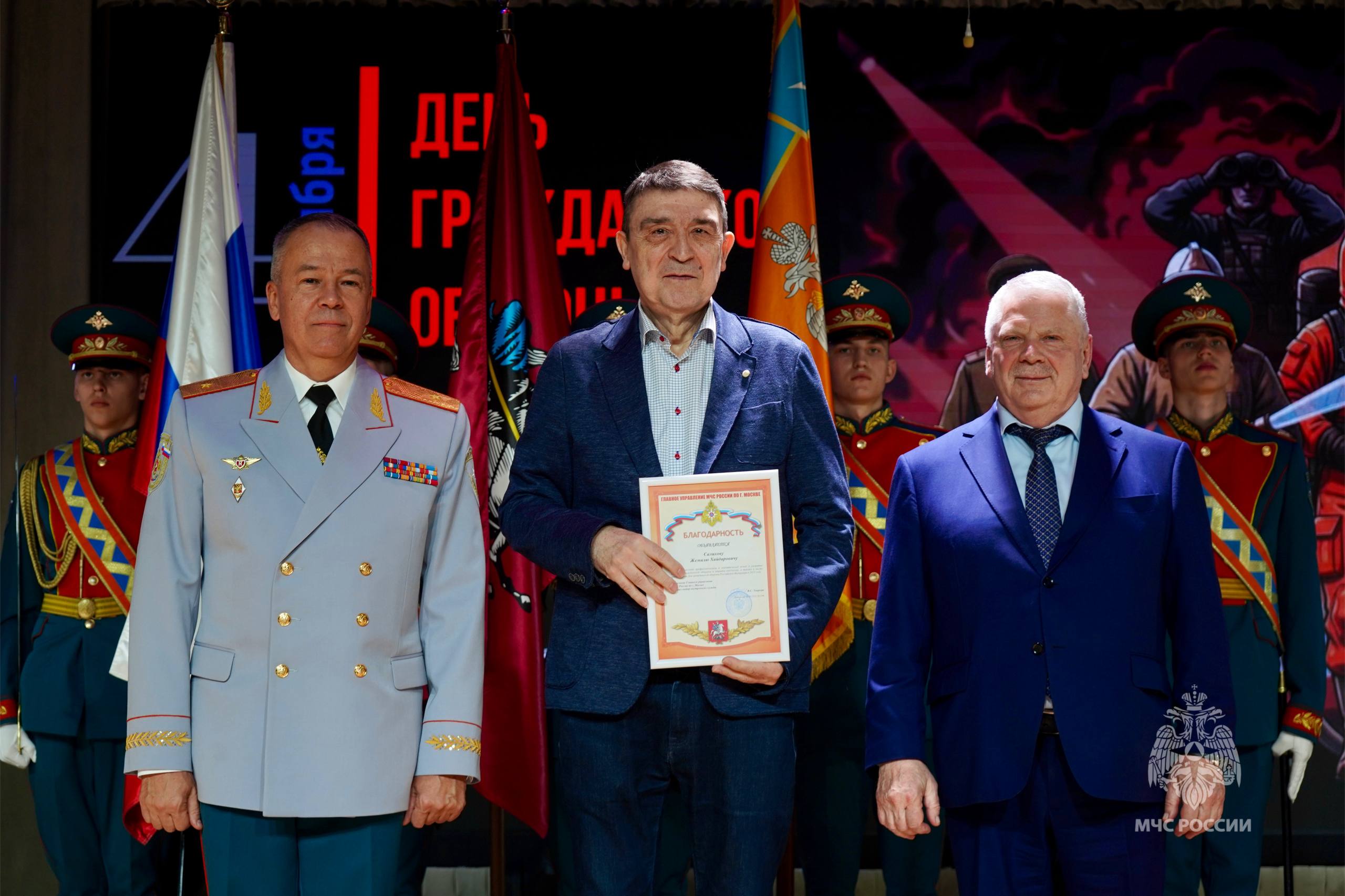 В торжественной обстановке ветеранам гражданской обороны, личному составу Главного управления МЧС России по г. Москве и Департамента по делам гражданской обороны, чрезвычайным ситуациям и пожарной безопасности были вручены ведомственные знаки отличия МЧС России, почетные грамоты и благодарности.