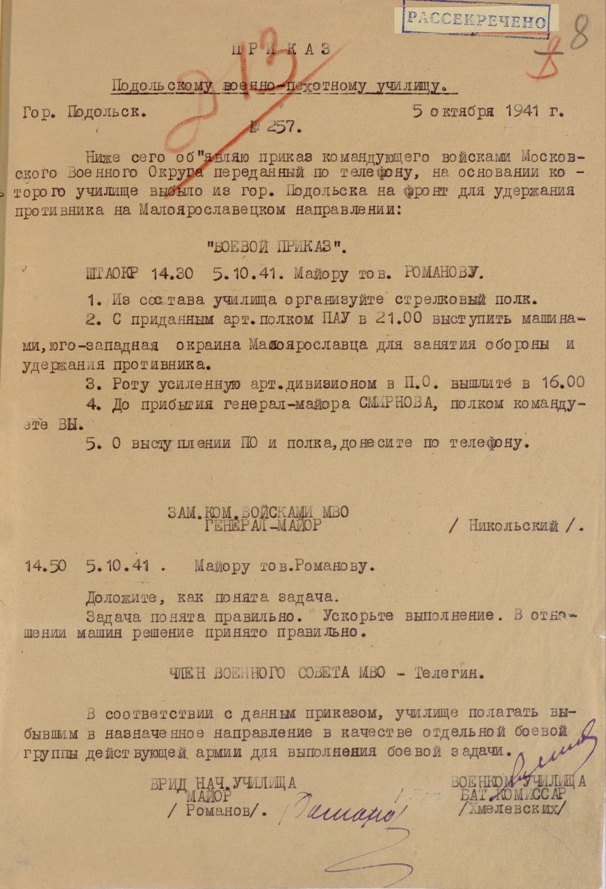 5 октября 1941 по боевой тревоге были подняты курсанты Подольского пехотного и артиллерийского училищ с целью сдержать продвижение фашистов к столице.