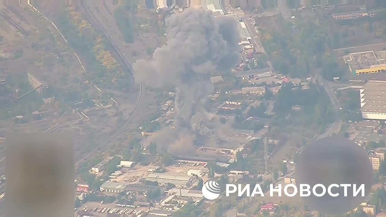 Прилет "Искандера" по цехам сборки БПЛА в районе оккупированного противником Херсона. Кадры МО РФ.