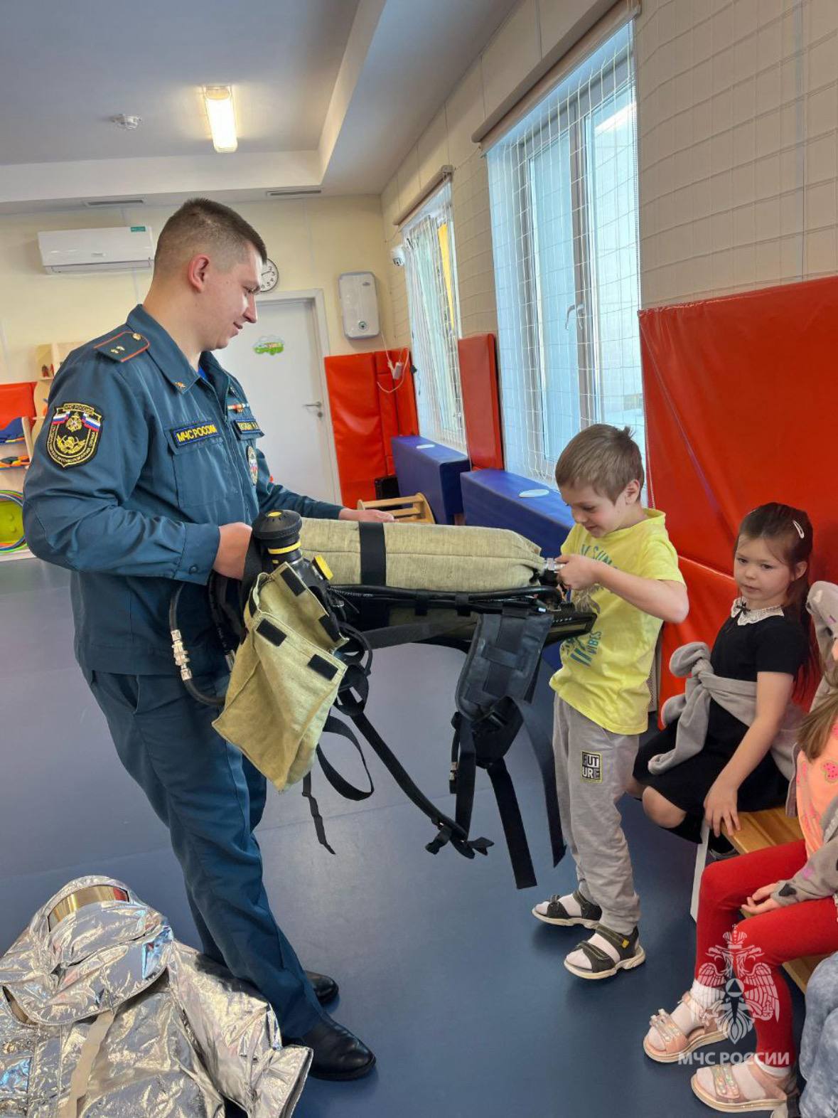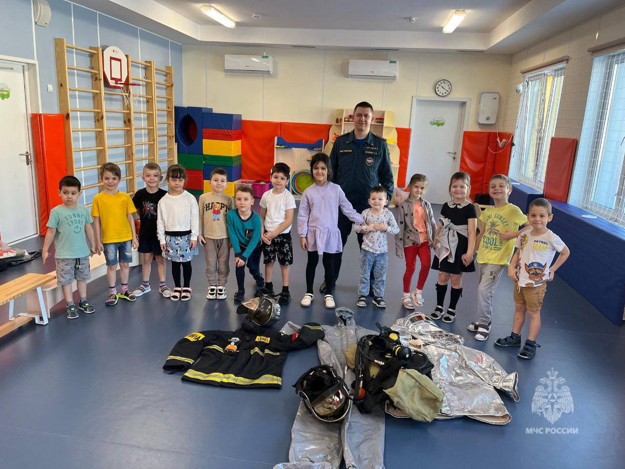 Специалист чрезвычайного ведомства подготовил для ребят интересную и познавательную программу. Малыши смогли примерить боевую одежду и теплоотражающие костюмы, узнали, какое оборудование используют огнеборцы при работе на пожарах.