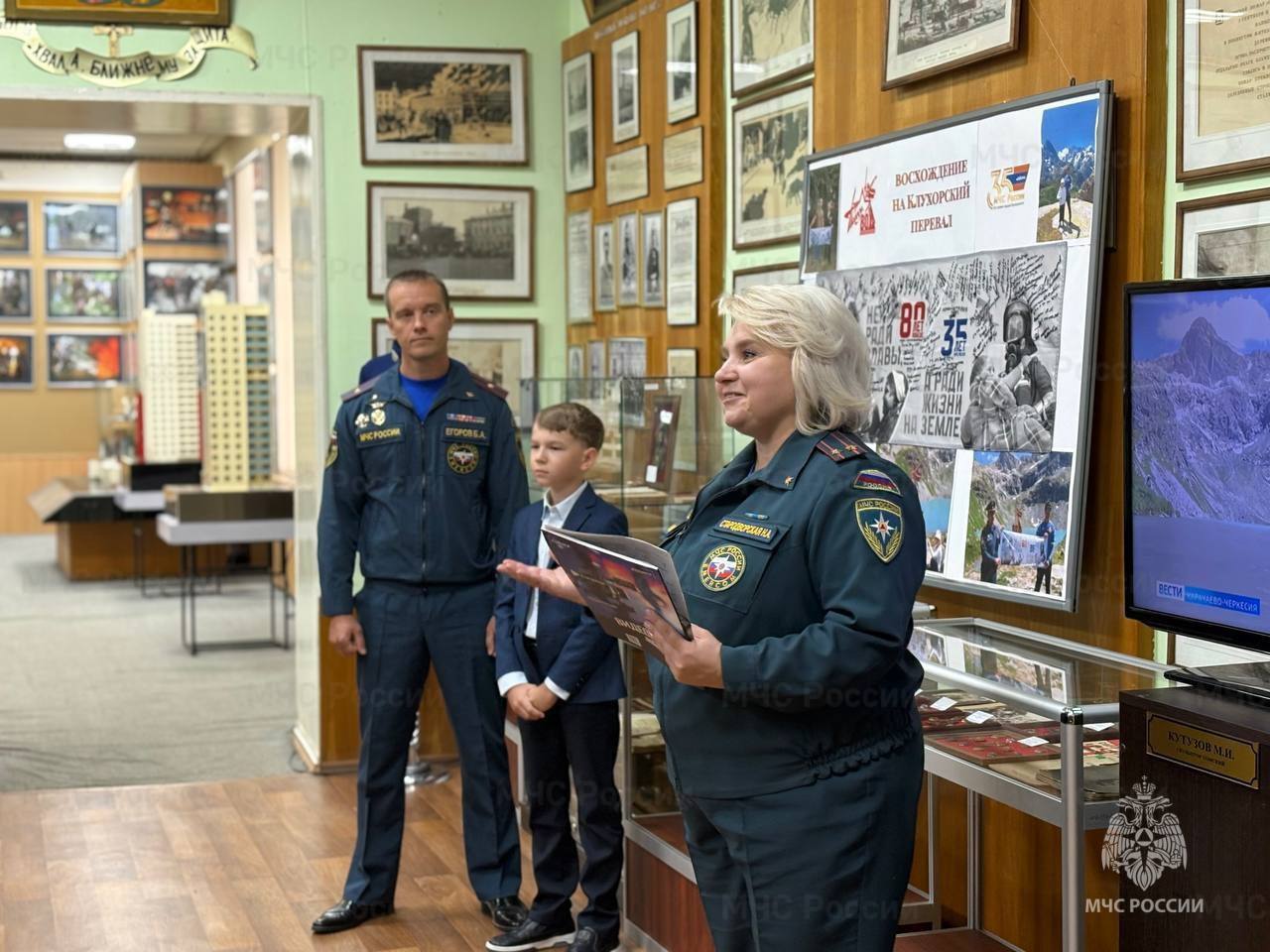 К гостям обратились участники восхождения – представитель Специального управления ФПС №20 МЧС России Борис Егоров и его сын Даниил. Они поделились впечатлениями от покорения Клухорской высоты и подчеркнули важность подобных мероприятий для сохранения исторической памяти.
