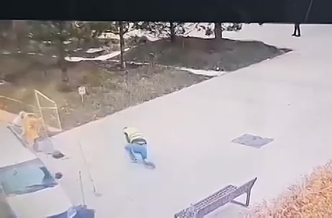 Стоявший во дворе строитель лишь чудом успел увернуться в самый последний момент и остался цел.