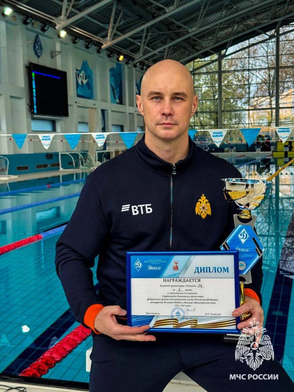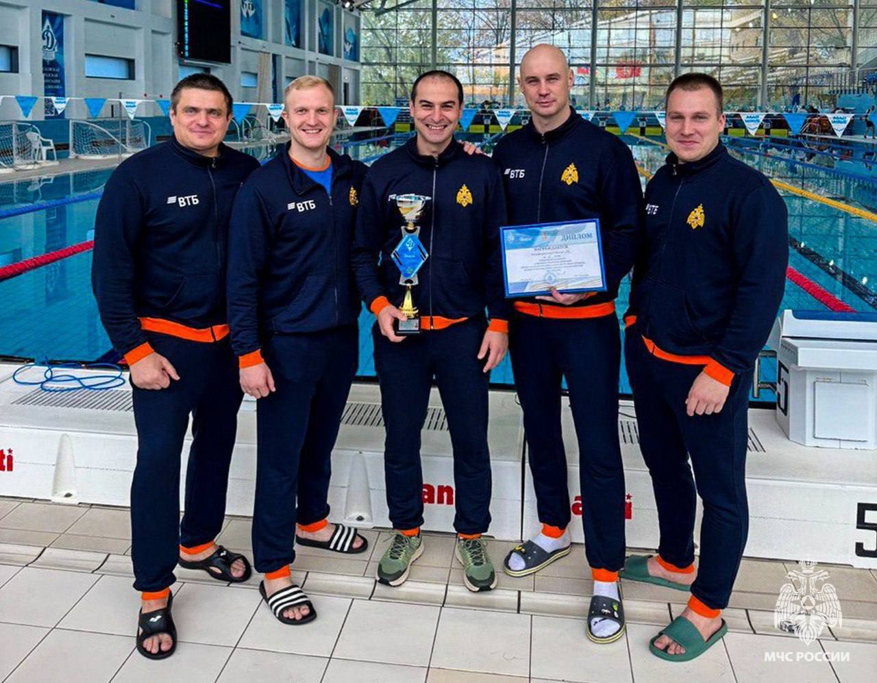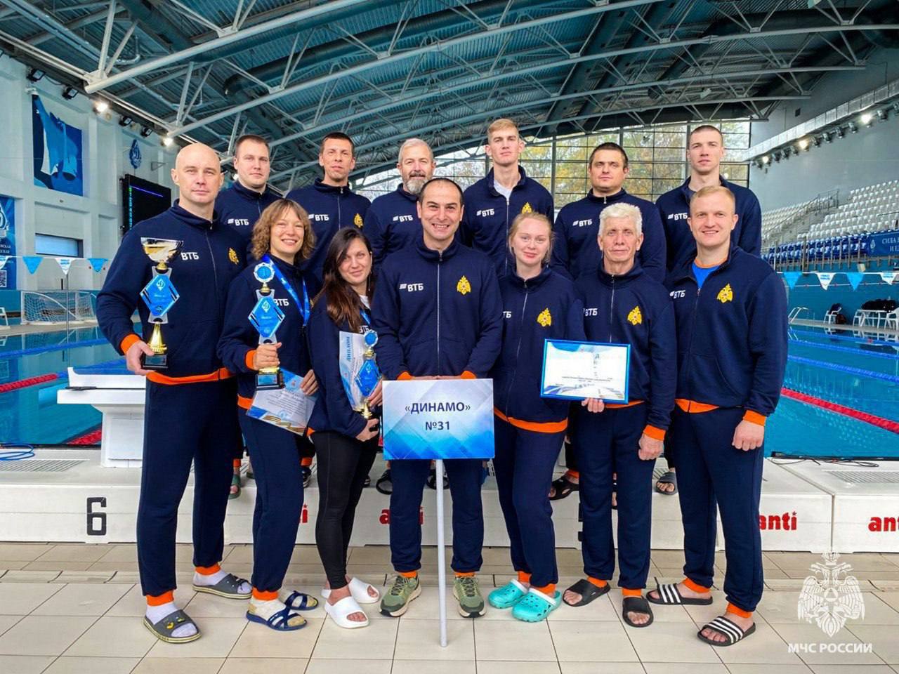 в плавании участники преодолевали 100-метровую дистанцию и эстафету 4х50 метров вольным стилем. По результатам всех заплывов среди 9 сборных в общекомандном зачете первое место заняли представители МЧС России.