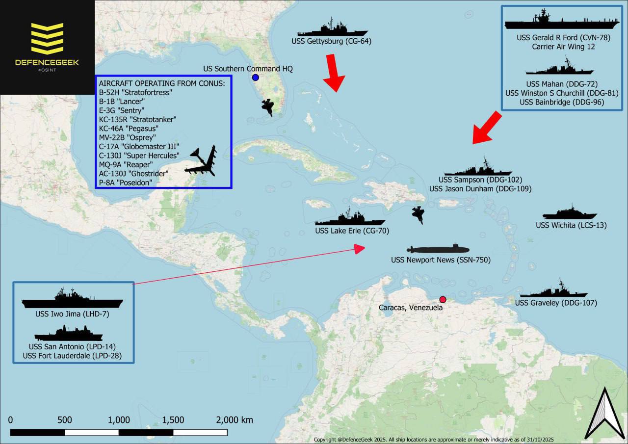 Штаты тем временем продолжают усиливать потенциальную ударную группировку. На следующей неделе в Карибский бассейн должен подойти авианосец USS Gerald R. Ford в сопровождении трех (по другим данным — пяти) военных судов с несколькими тысячами военнослужащих на борту.