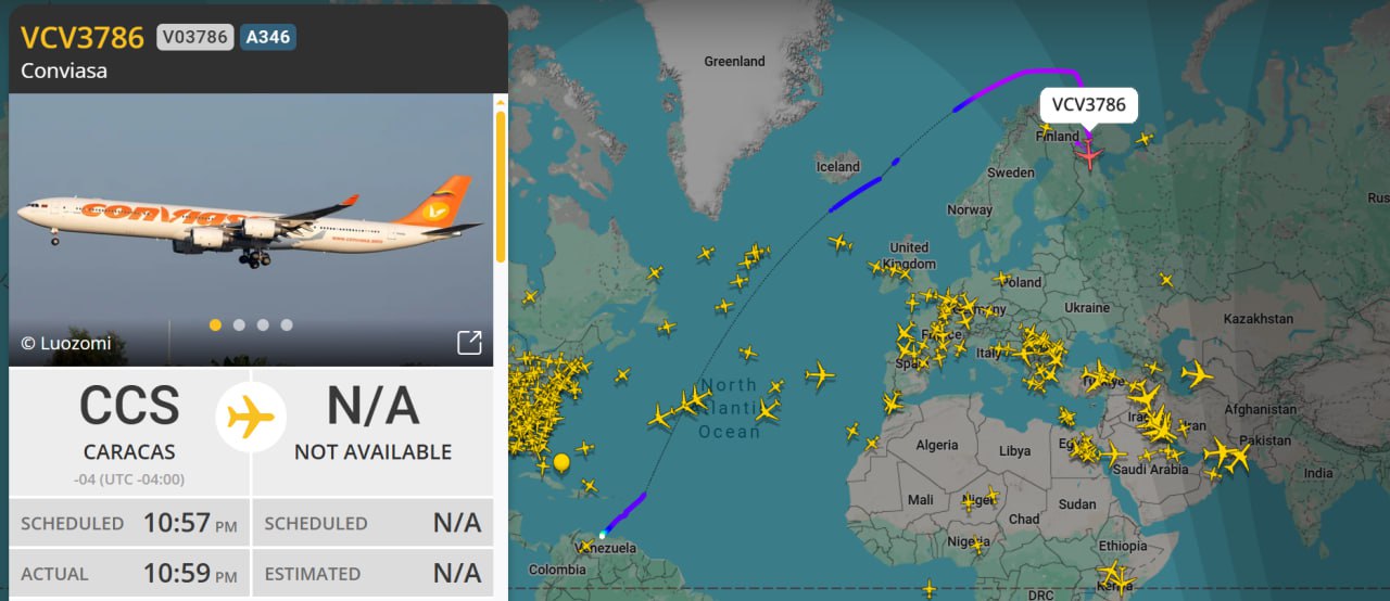 Западные мониторинговые ресурсы заявляют о росте числа рейсов из Каракаса в Москву. Перелеты совершает венесуэльская авиакомпания Conviasa. Один из самолетов прямо сейчас находится в воздушном пространстве России.