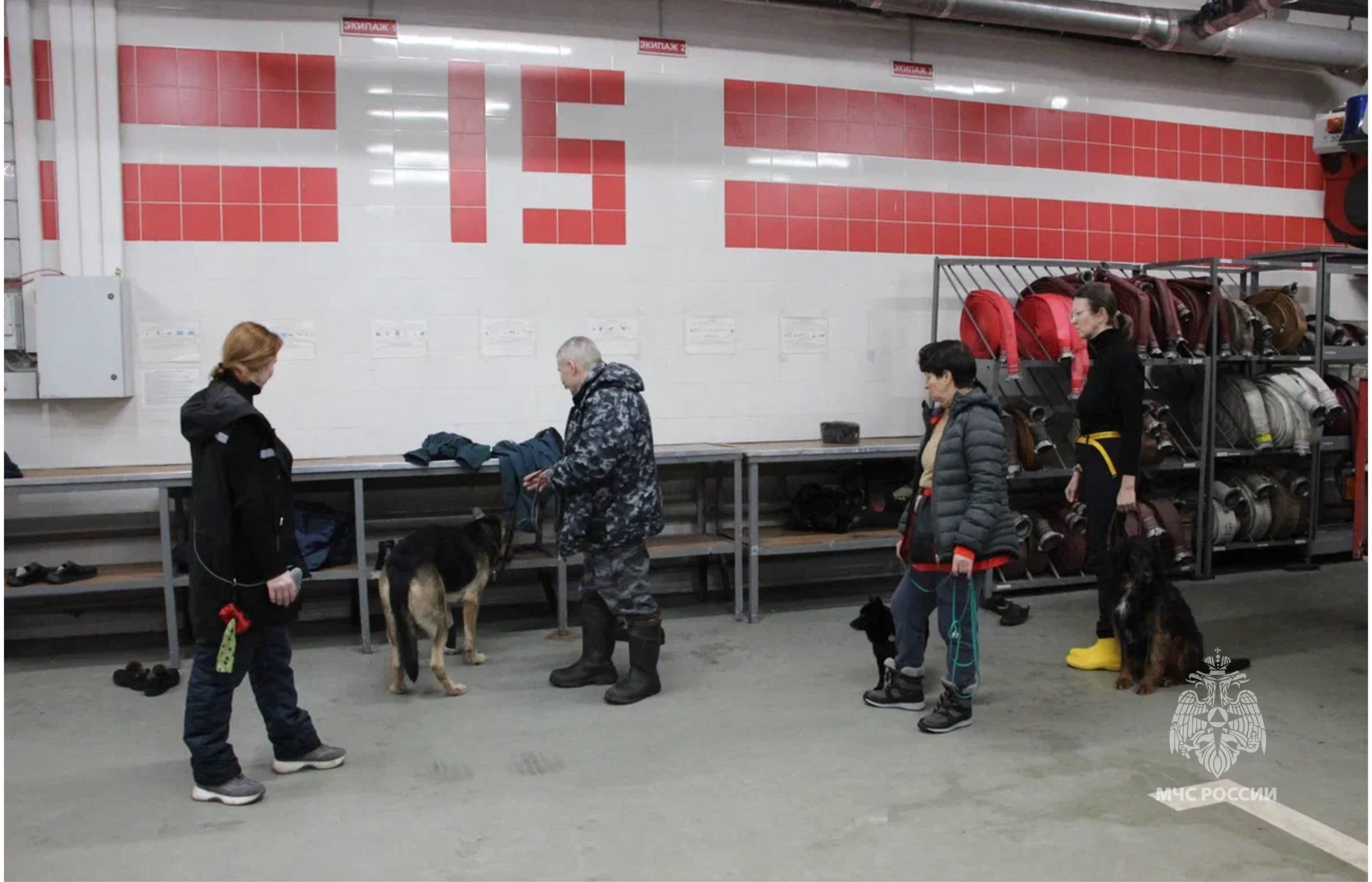 Под руководством ветерана пожарной охраны Валерия Еломанова, который больше тридцати лет прослужил в должности начальника караула 15 ПСЧ, проводники со своими четвероногими друзьями искали в гараже части различные предметы, расположенные на разных уровнях.