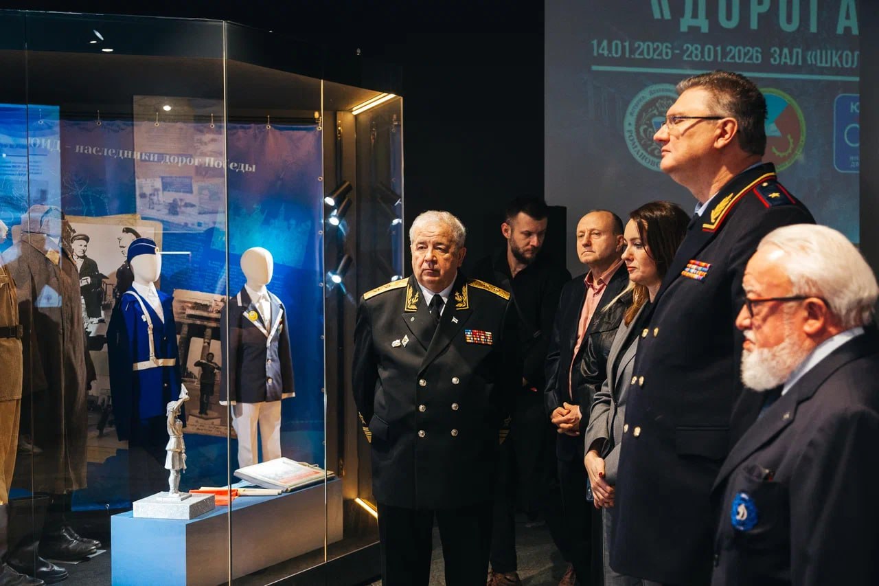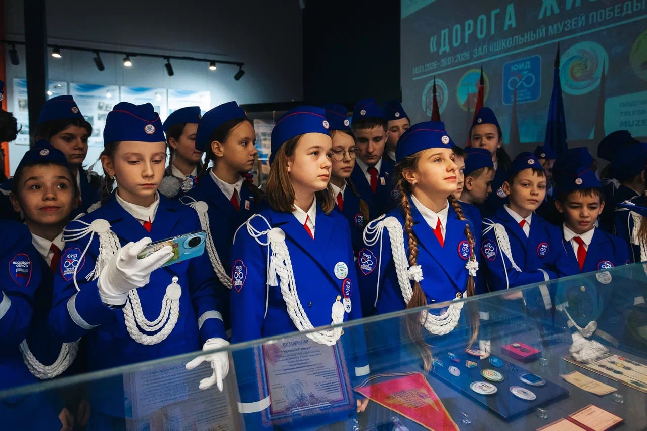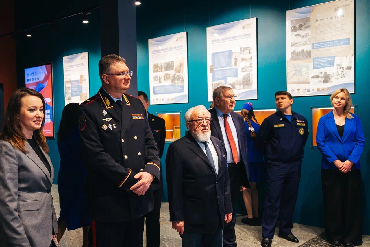 Заместитель руководителя российской Госавтоинспекции Олег Понарьин и юные инспекторы движения открыли выставку «Дорога жизни» в Музее Победы на Поклонной горе в Москве