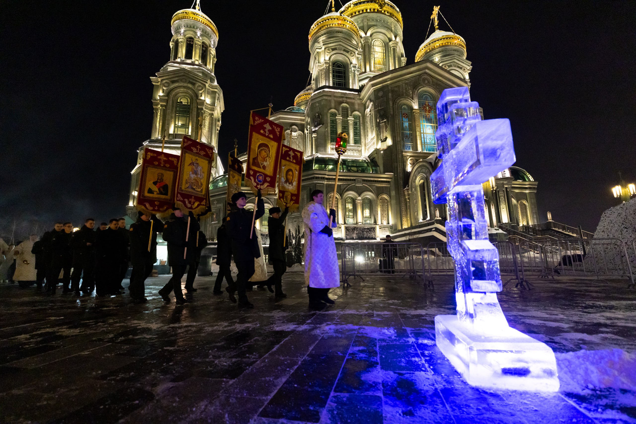 В ночь с 18 на 19 января в Главном храме ВС РФ прошли торжественные мероприятия, посвящённые празднованию Святого Богоявления – Крещения Господня. Их посетили более 2 тысяч человек, в том числе военнослужащие Московского гарнизона, члены их семей, а также жители Москвы и Подмосковья. Они поклонились главной иконе храмового комплекса «Спас Нерукотворный», подаренной собору Президентом Российской Федерации Владимиром Путиным в 2020 году, приняли участие в молебне, посвящённом Богоявлению – Крещению Господню, а также окунулись в Иордань.