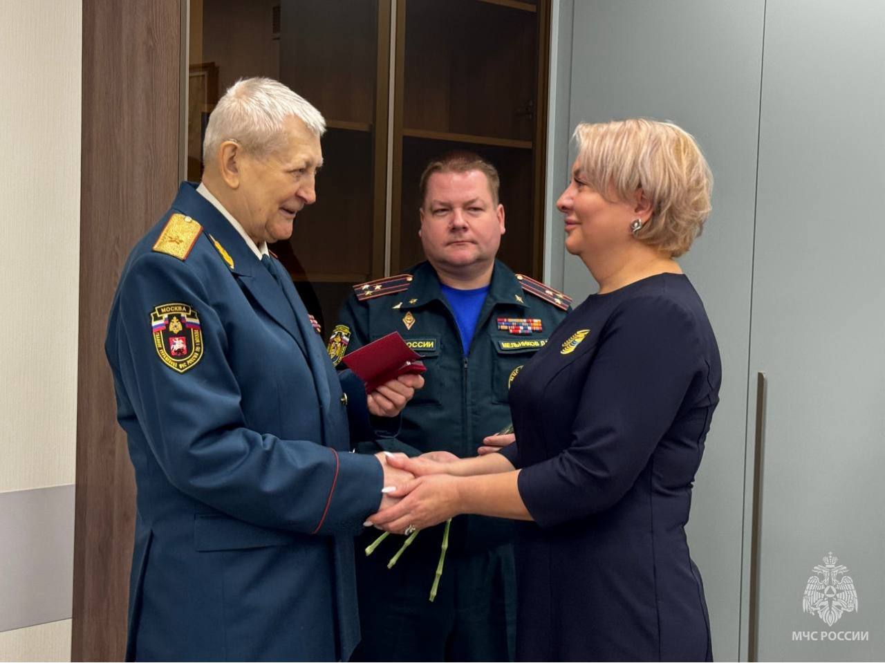 Почетный председатель совета ветеранов ГУ МЧС России по г. Москве Леонид Коротчик и начальник Управления по ЮАО ГУ МЧС России по г. Москве Дмитрий Мельников наградили ведомственными медалями МЧС России сотрудников центра за заслуги в реализации единой государственной политики в области гражданской обороны. Почетными грамотами была отмечена активная работа специалистов в области обеспечения пожарной безопасности.