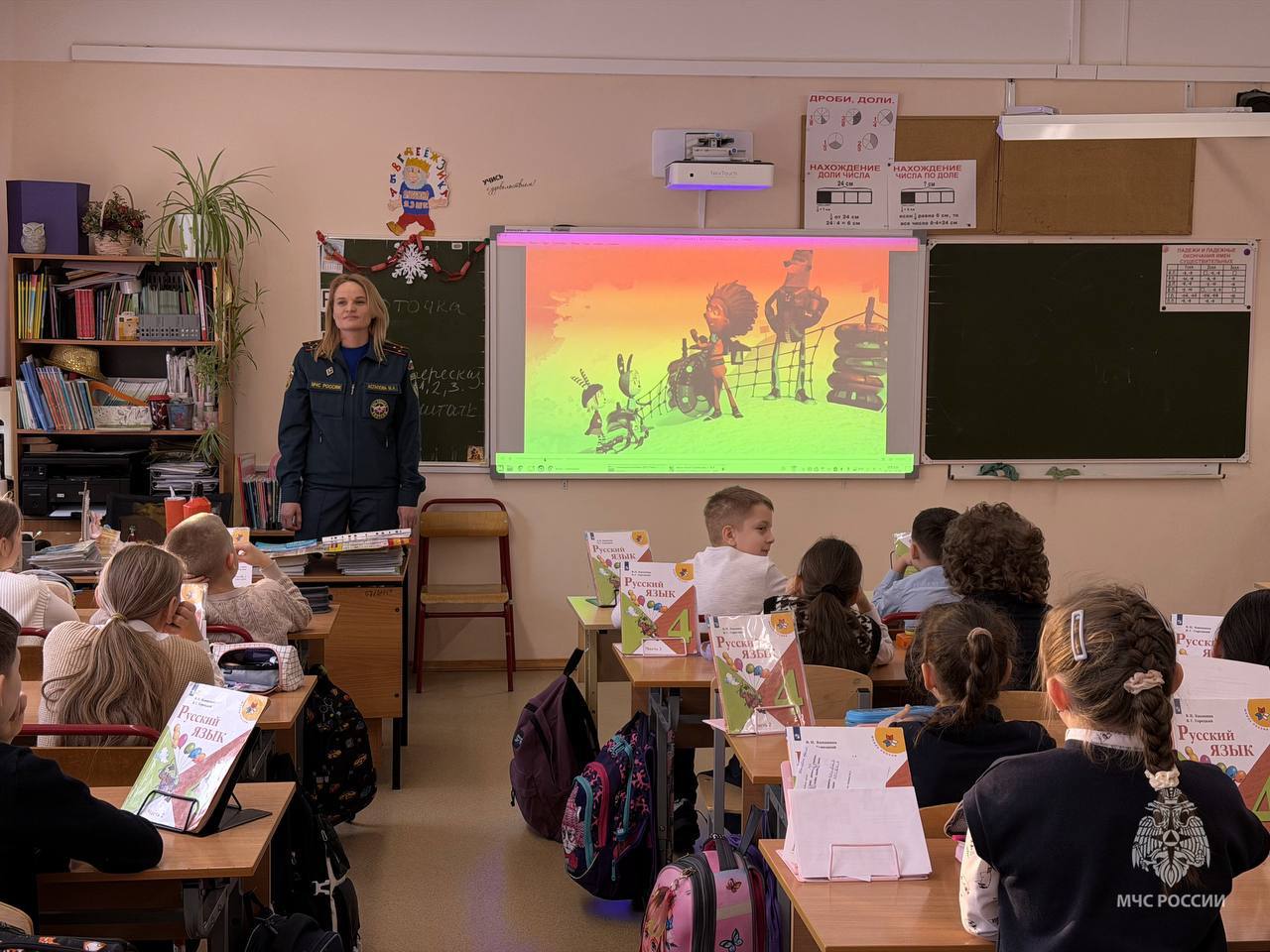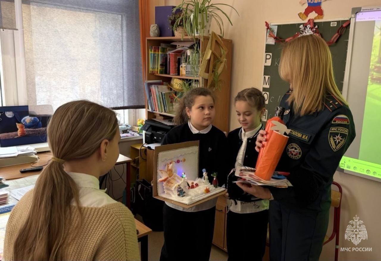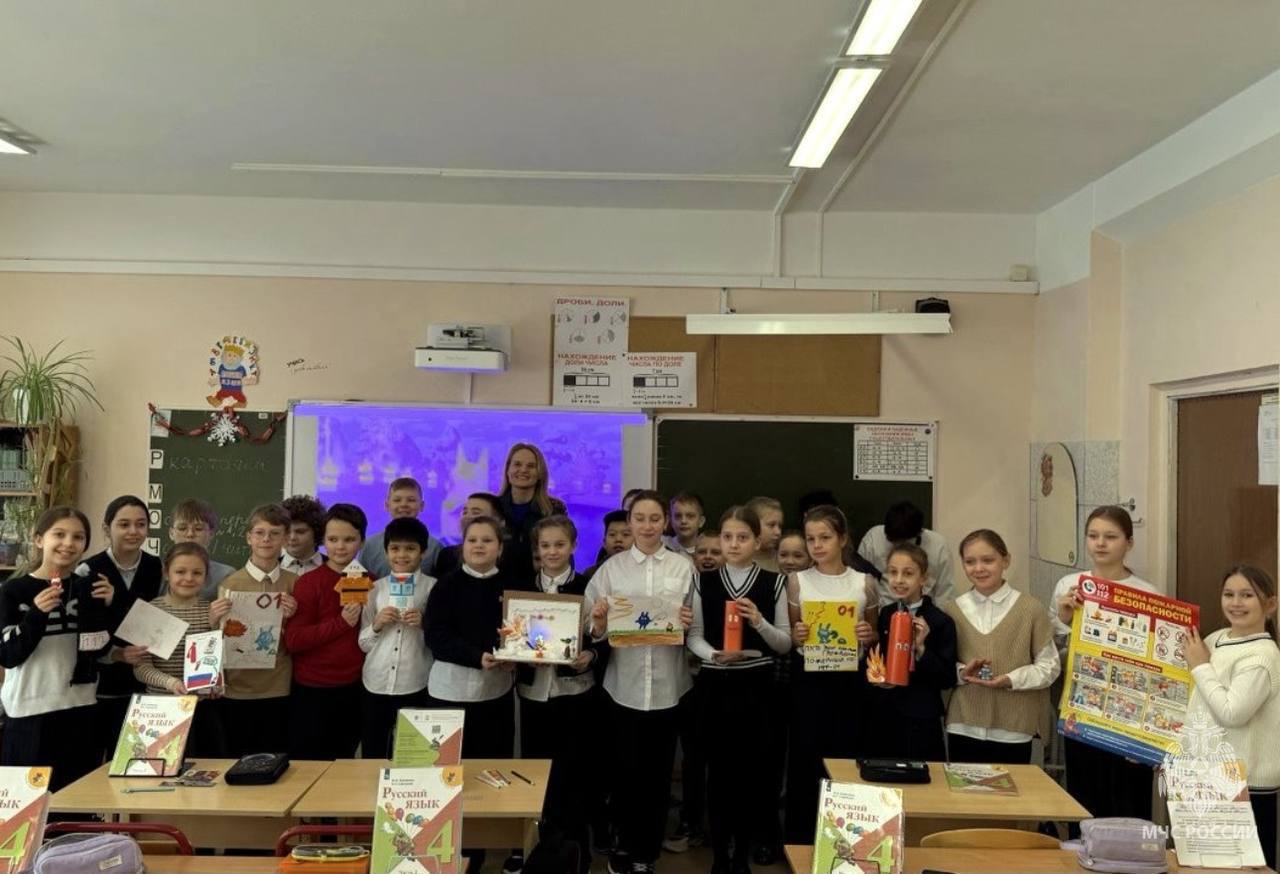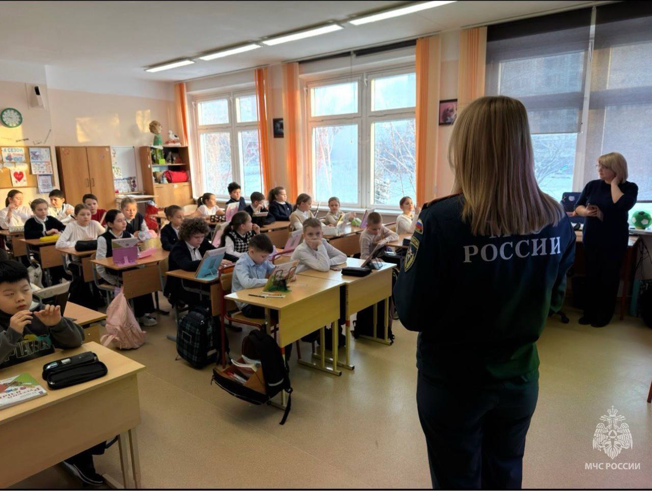 Безопасная зима. Старший инженер 3 РОНПР Управления по ЮВАО ГУ МЧС России по г. Москве Мария Астапова провела урок безопасности для учащихся начальных классов в школе 1357