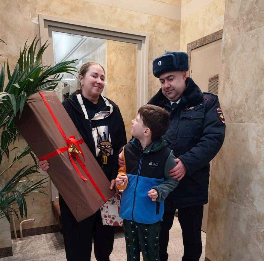 Врио начальника ЛО МВД России на станции Москва-Белорусская подполковник полиции Алексей Воронцов совместно с начальником ОРЛС Ириной Щегловой приехал в гости к мальчику поздравить с наступившим Новым годом и вручил долгожданный самокат и сладкий подарок.