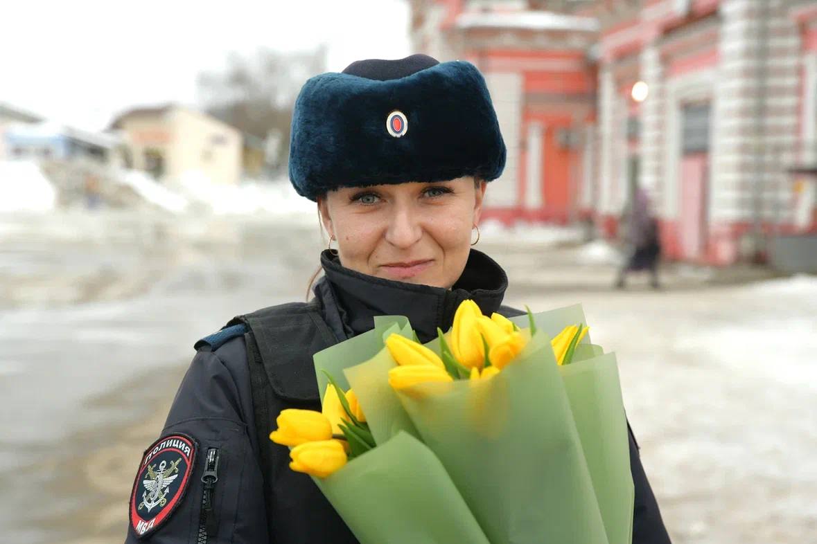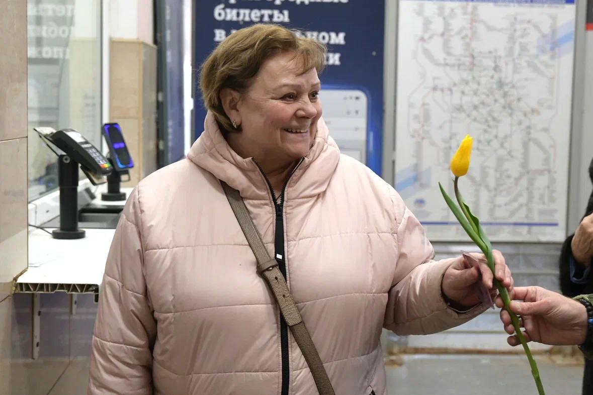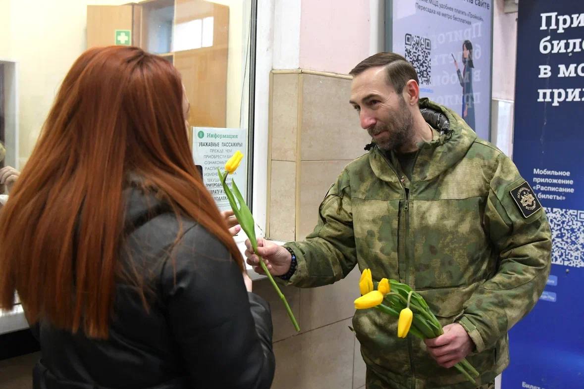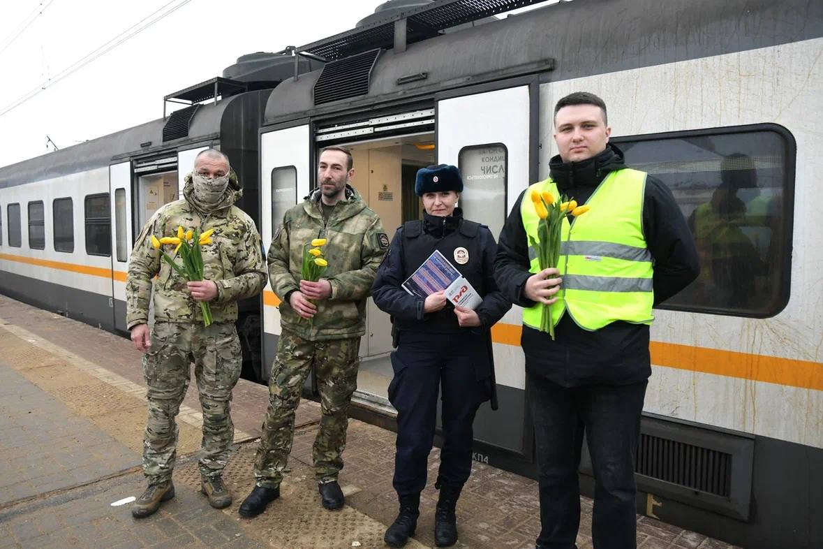 В Дмитровском округе транспортные полицейские поздравили женщин с 8 Марта и напомнили о безопасности на железной дороге