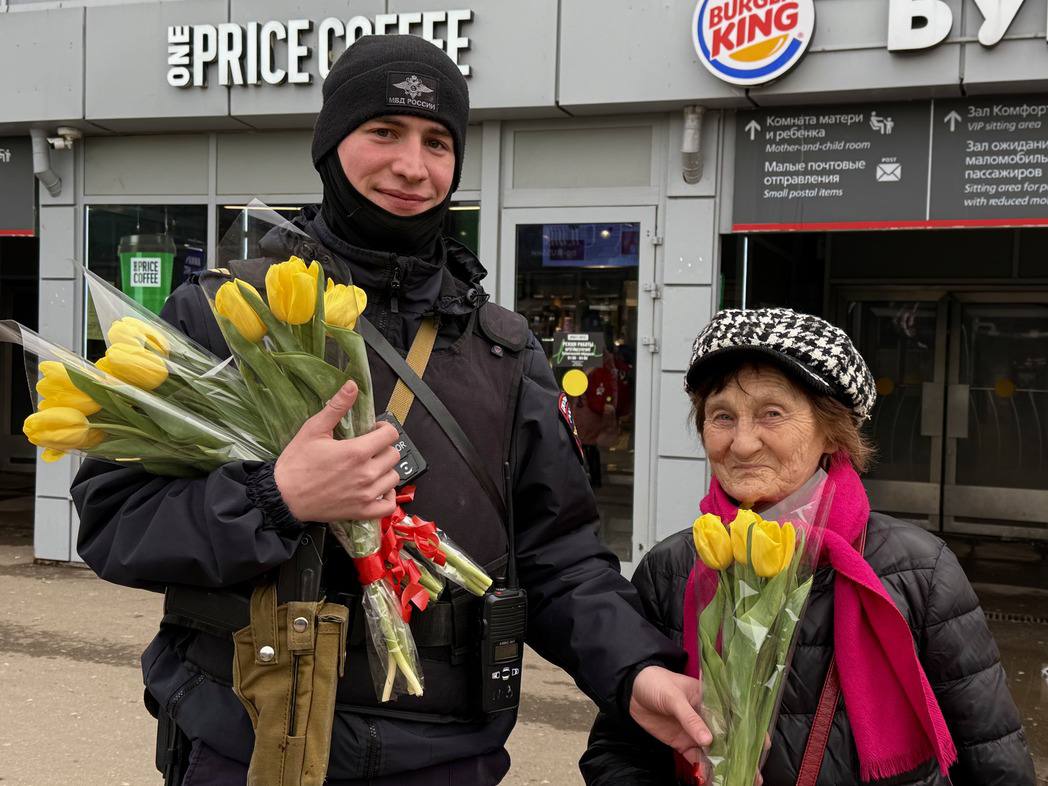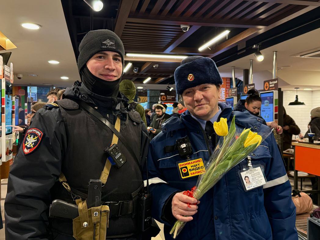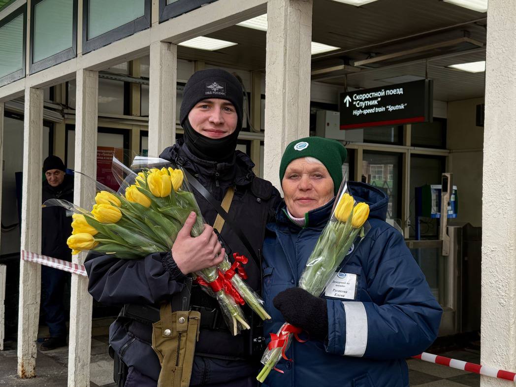 Сотрудники транспортной полиции вышли к пассажирам и работницам железной дороги, чтобы лично поздравить их с праздником. Яркие букеты желтых тюльпанов стали символом весны и внимания для всех представительниц прекрасного пола, встреченных полицейскими.