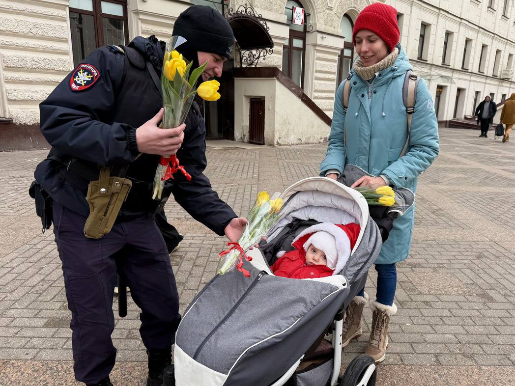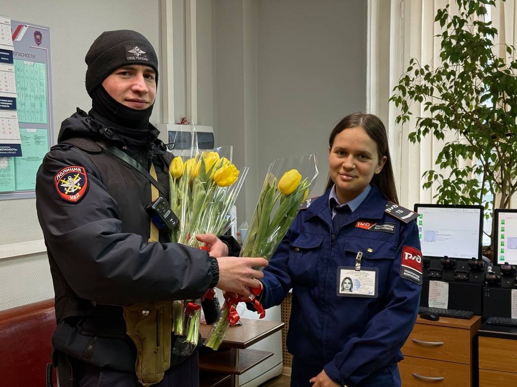 «Прекрасные дамы! Желаем Вам крепкого здоровья, семейного благополучия, весеннего настроения и любви», — такими словами сопровождали стражи порядка свои подарки.