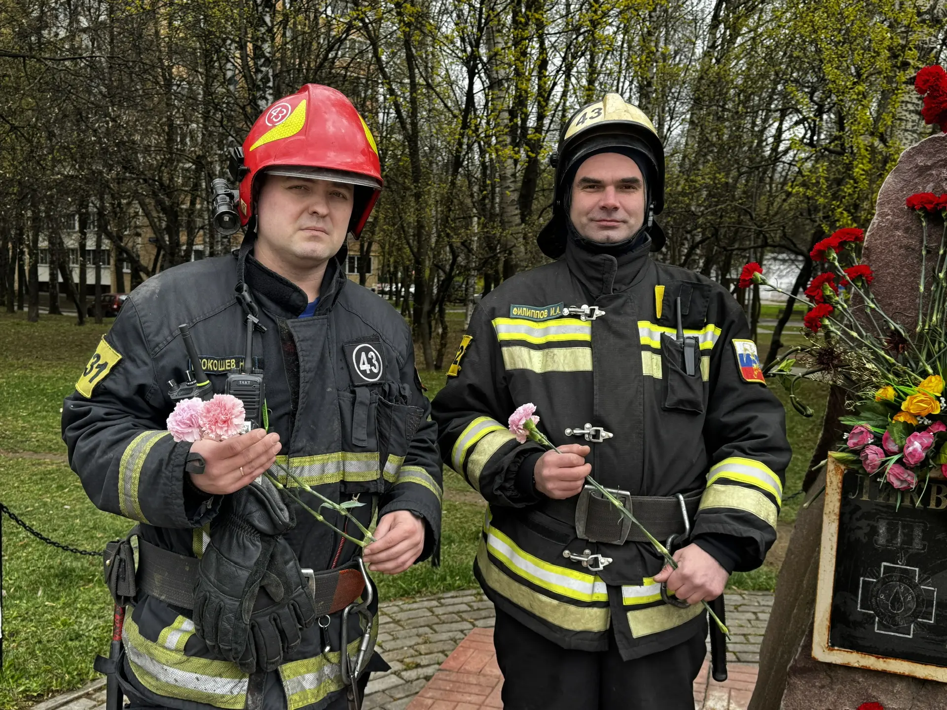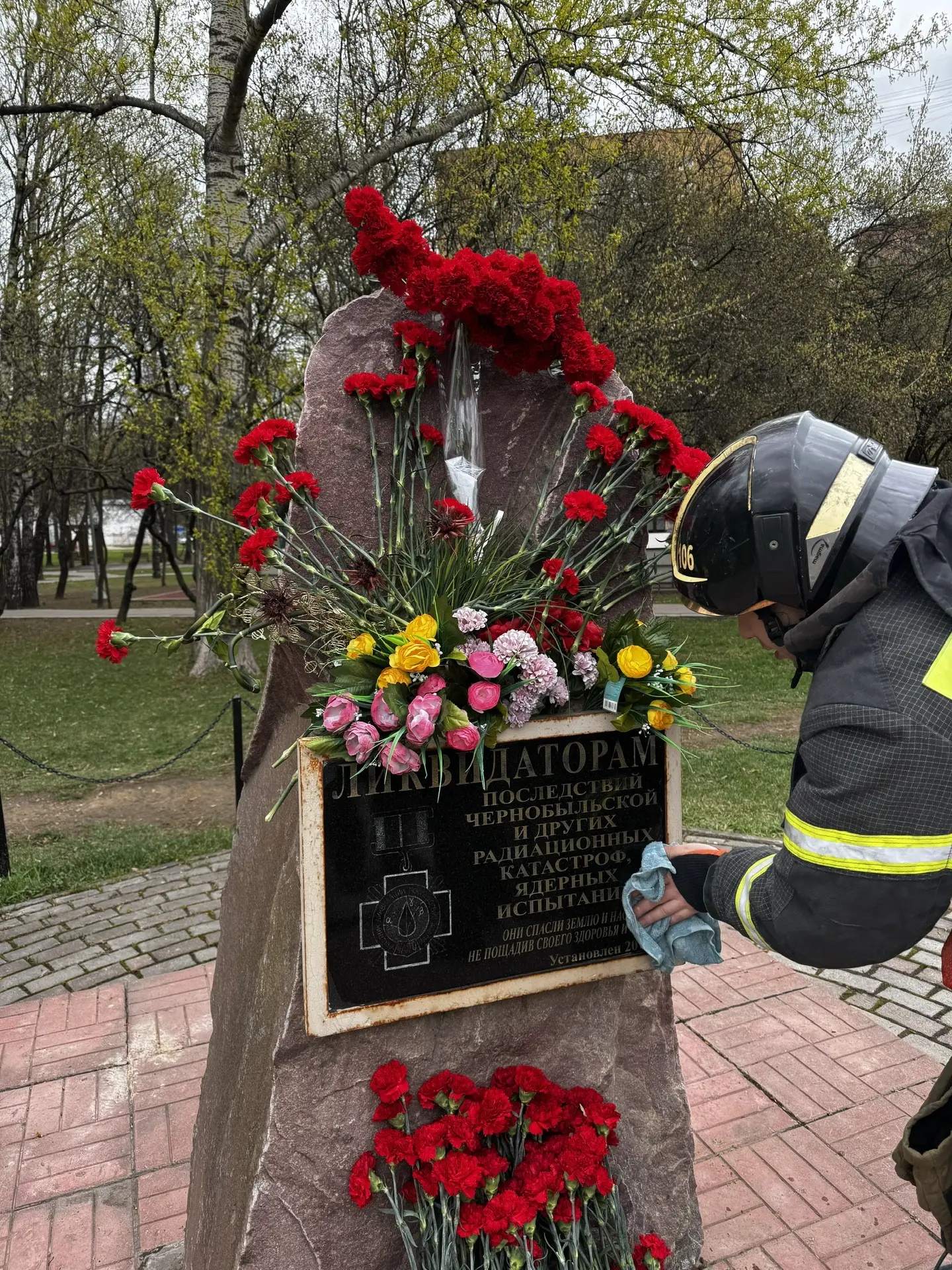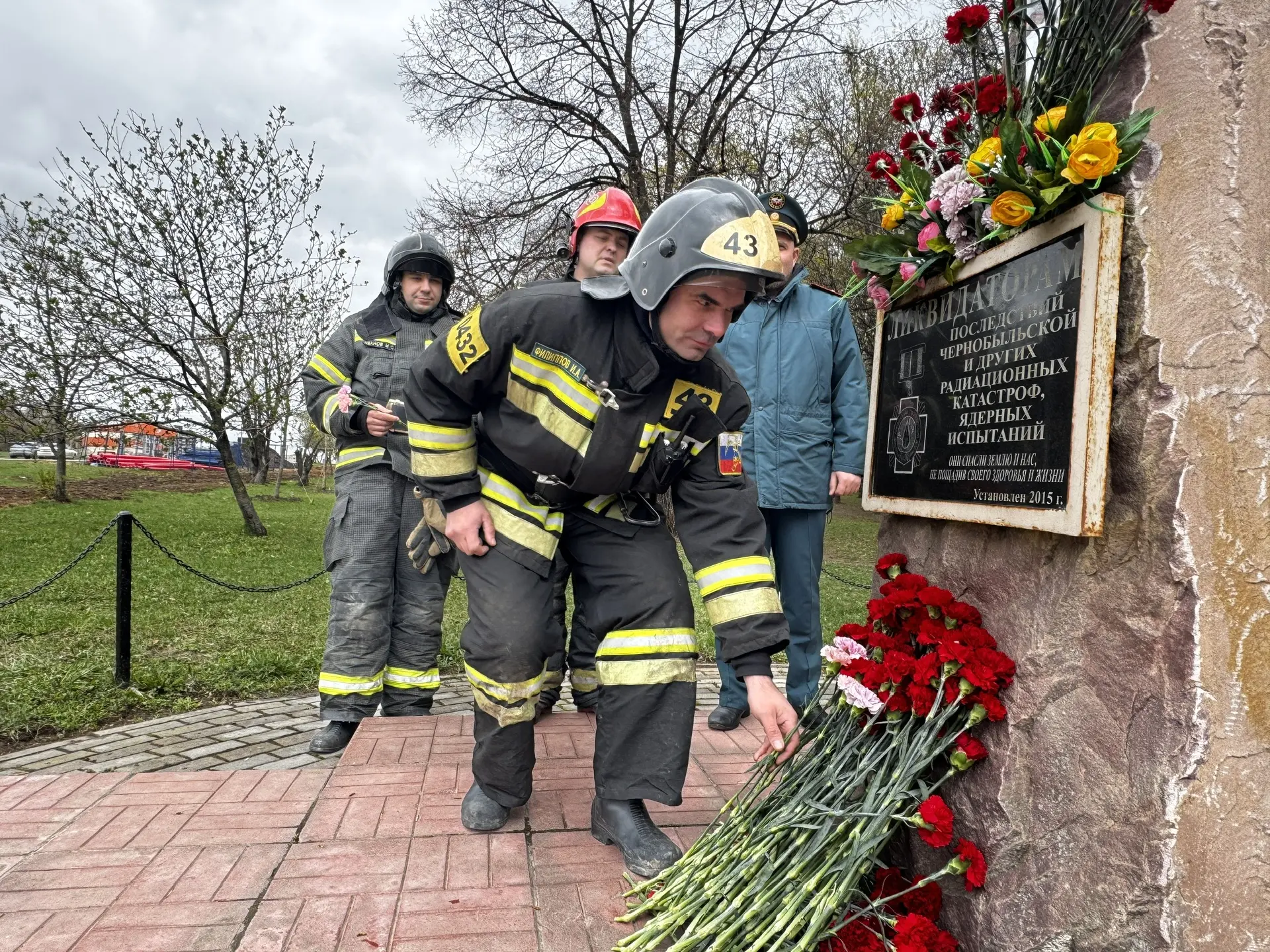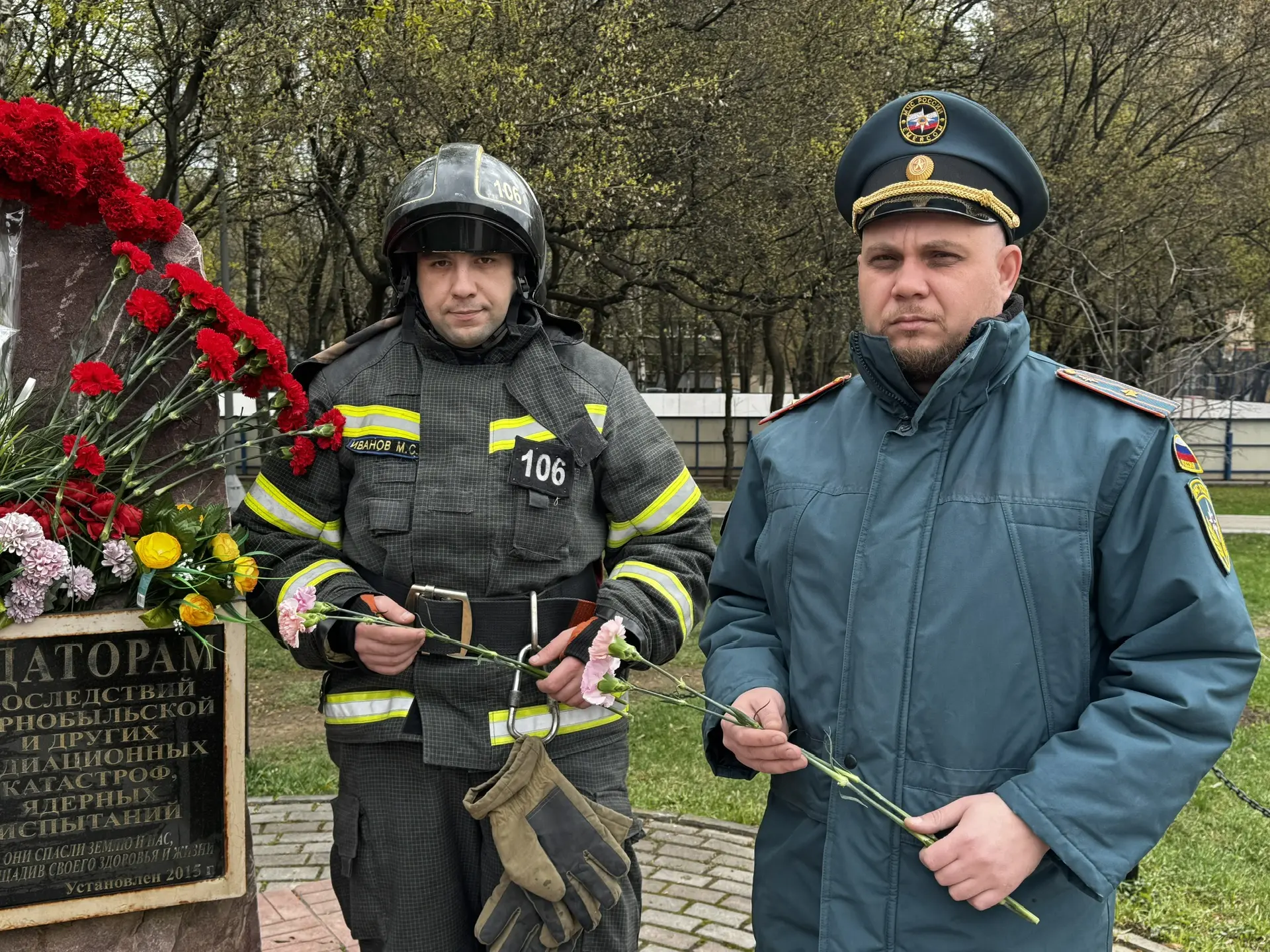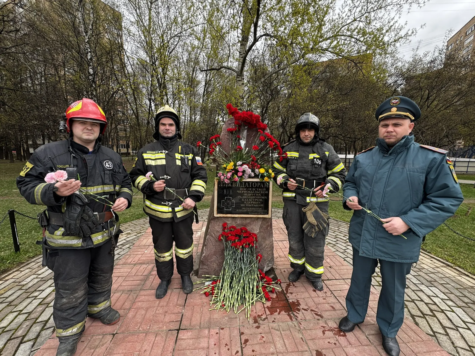 В память о ликвидаторах последствий радиационных и ядерных аварий сотрудники дежурного караула 43 ПСЧ Управления по ЮАО ГУ МЧС России по г. Москве возложили цветы к мемориальному камню в сквере на Пролетарском проспекте в районе Царицыно.