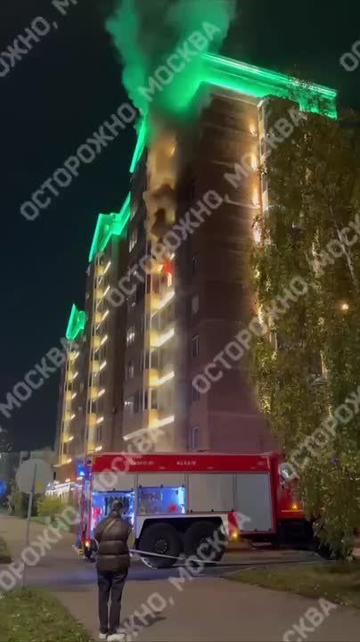 Пожар в жилом доме произошел в 20 микрорайоне Зеленограда. На кадрах видно, как языки пламени вырываются из окна квартиры на 6-м этаже, а дым из-за подсветки приобрел зеленый оттенок.Как сообщили «Осторожно, Москва» очевидцы...