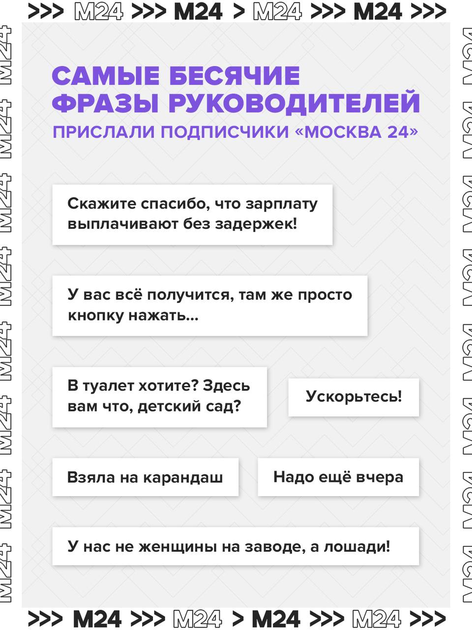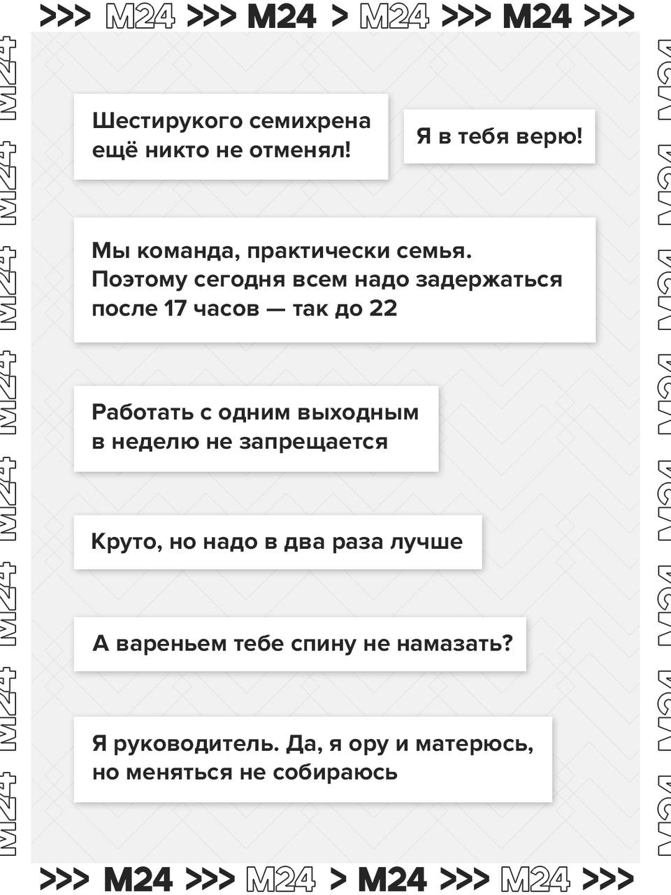 Помимо плохих начальников существуют и плохие подчинённые, так ведь? Боссы и директора — теперь ваш выход! Присылайте к нам в @infomoscow24bot самые бесящие фразы от сотрудников — пусть им тоже достанется.