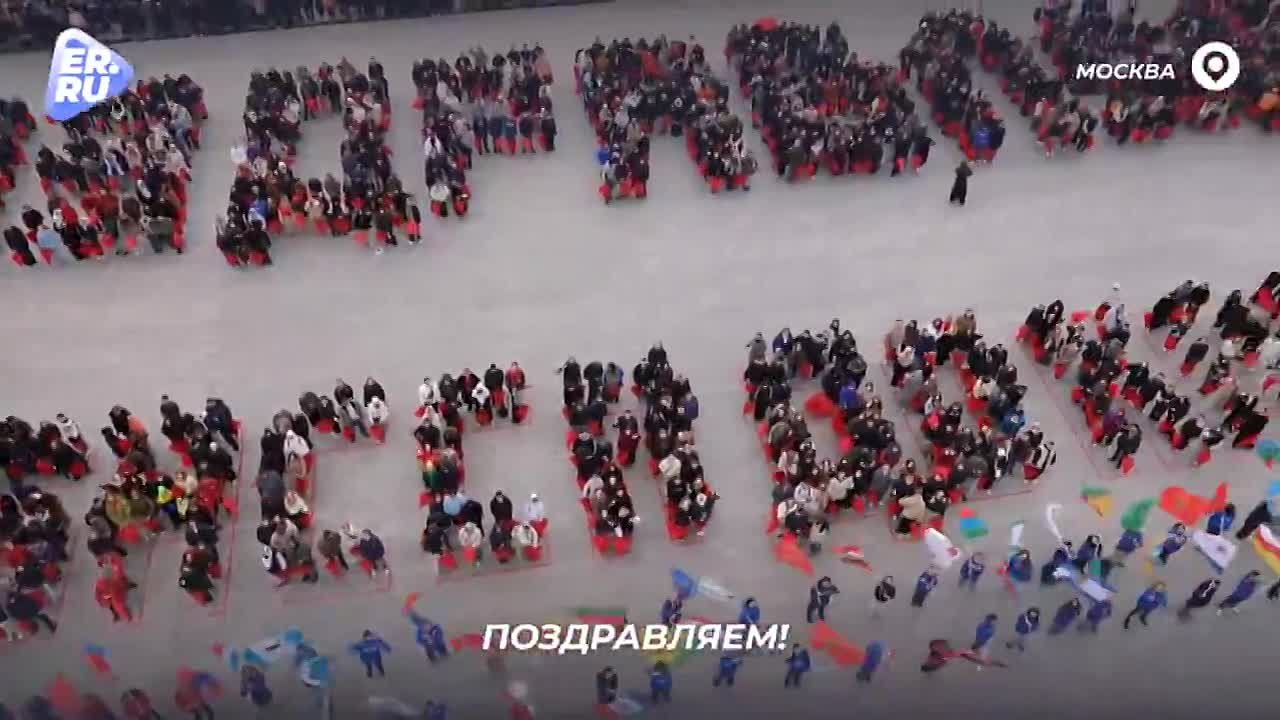 Тысячи активистов Молодой Гвардии и Волонтерской Роты вышли на акции в регионах. В Москве они выстроились в живую надпись Поздравляем от Донбасса до Камчатки и подняли флаги всех 89 регионов.