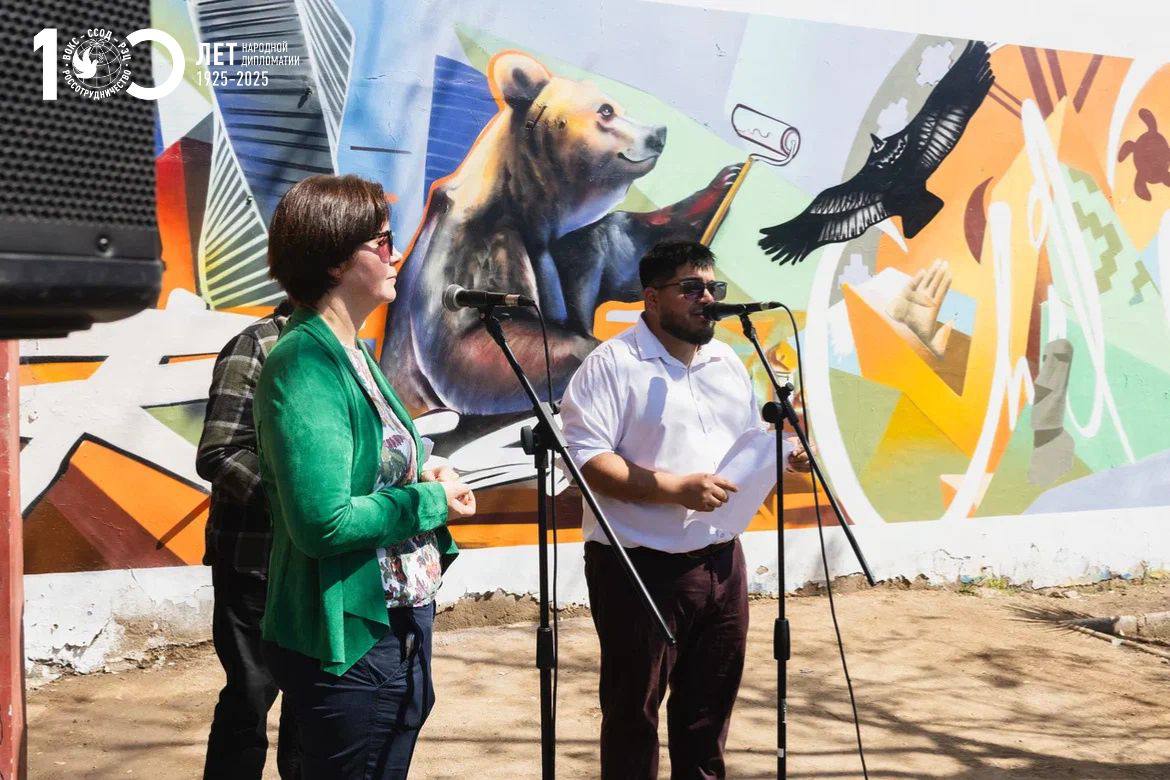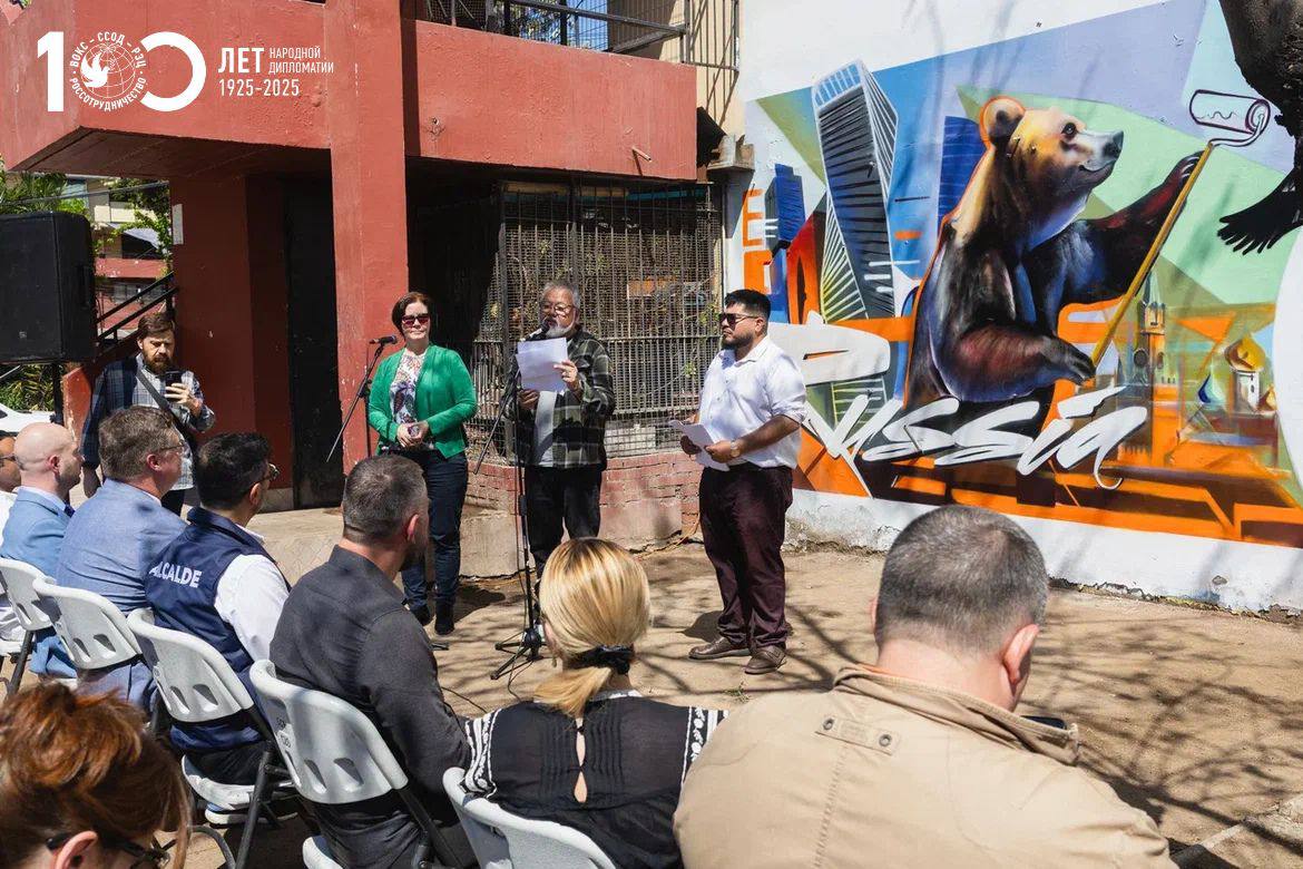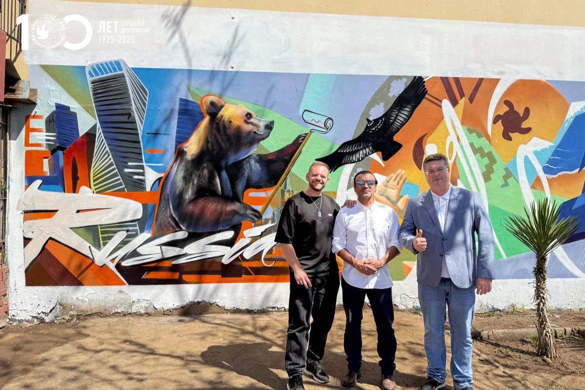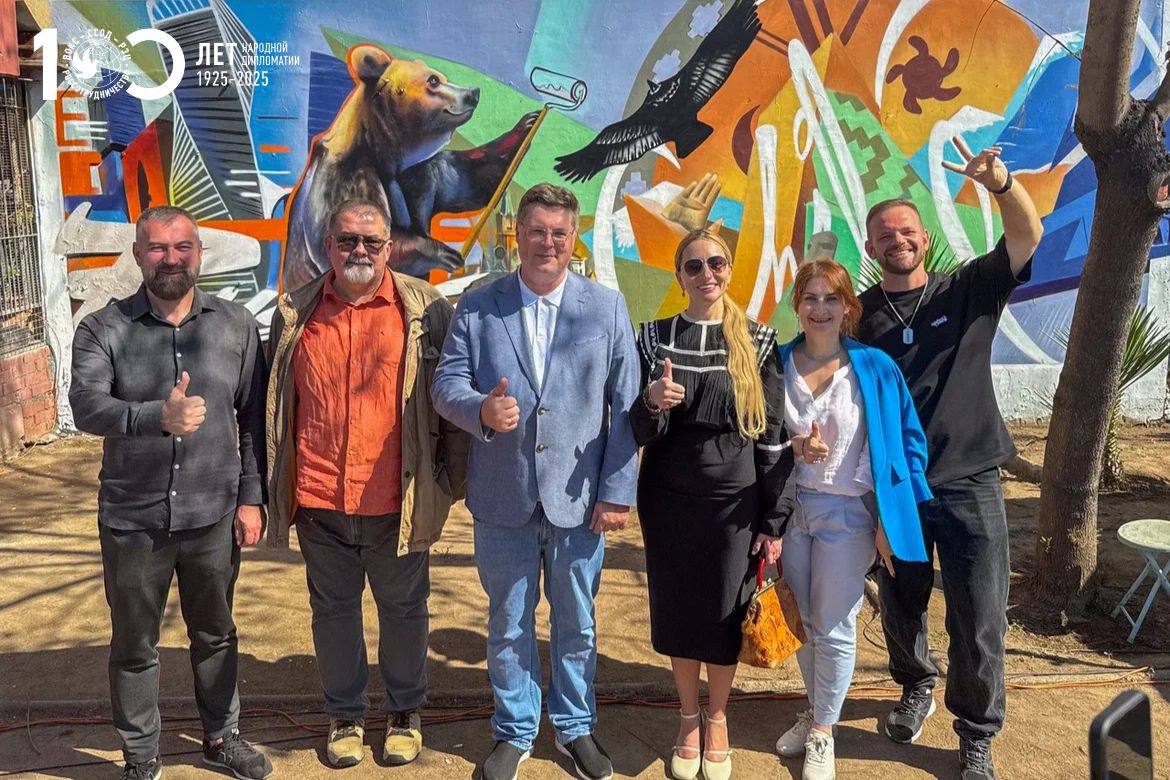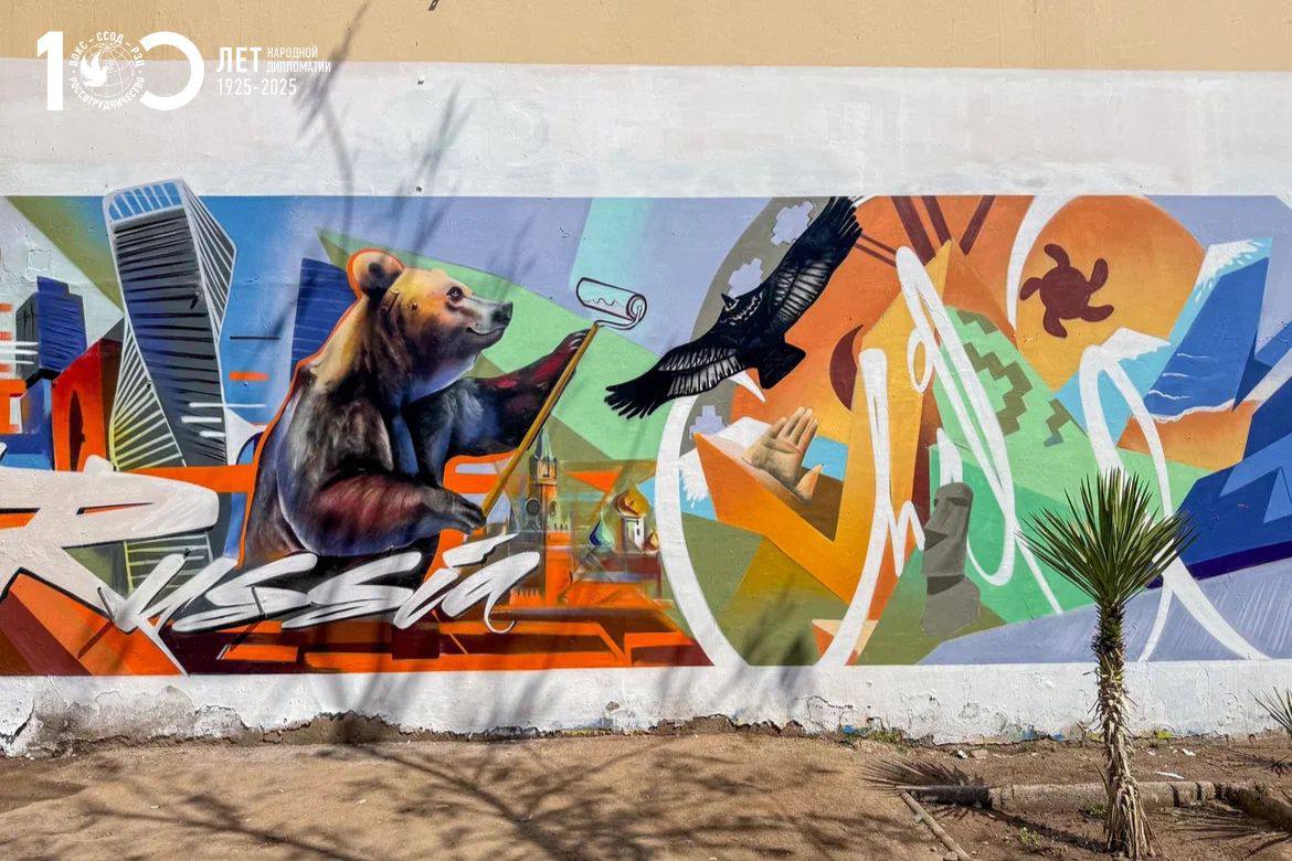 Мурал создан российским и чилийским художниками Дмитрием Кубраковым и Диего Роа. Россия представлена бурым медведем, башнями Кремля, куполами Покровского собора и небоскребами Москва-сити. Чили раскрывается в цветовом спектре. Теплые тона напоминают о пустыне и ее символе, Руке пустыни, возвышающейся как памятник посреди засушливой местности. Зеленые тона представляют центральную долину, где возвышаются каменные изваяния острова Пасхи – Моаи. Синие цвета напоминают о юге страны, ее ледниках и морях, с китом, символизирующим холодные и глубокие воды.