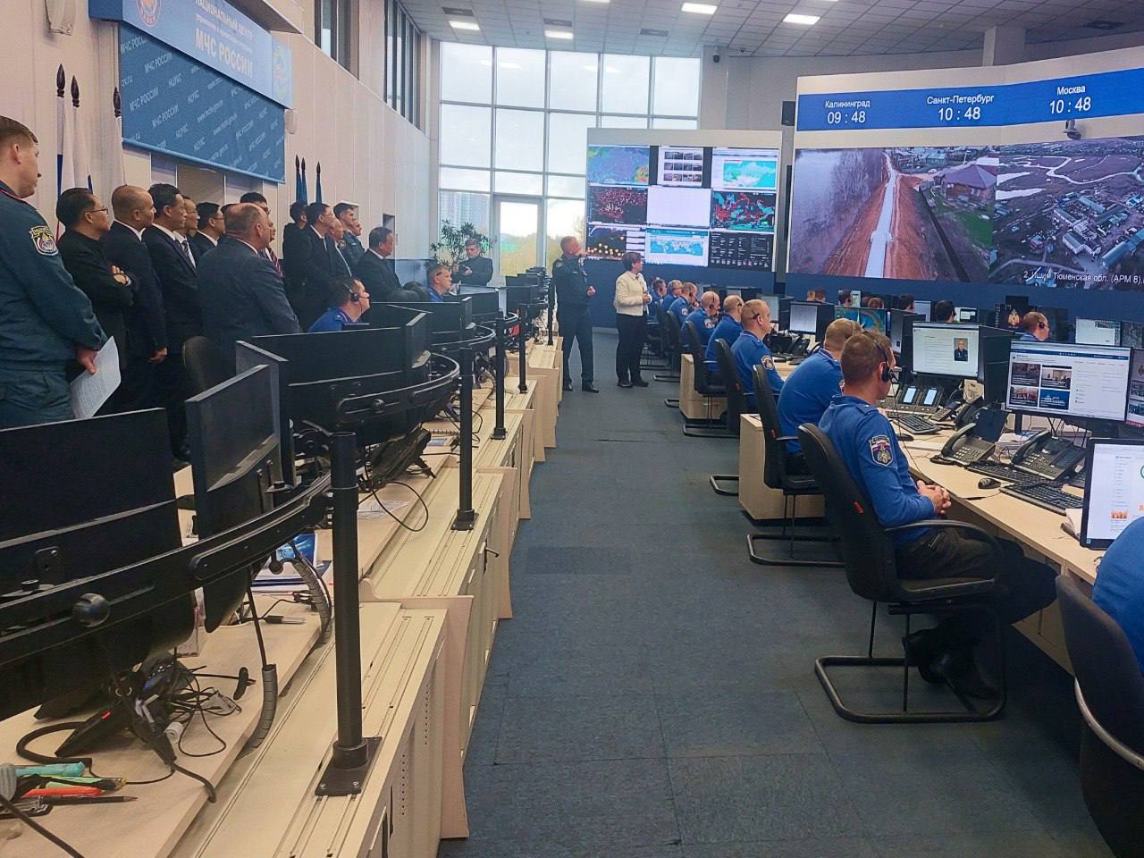 В первой половине дня для китайских специалистов был организован визит в Национальный центр управления в кризисных ситуациях МЧС России. Эксперты ознакомились с работой оперативной дежурной смены, ведущей наблюдение за ситуацией во всех регионах России в режиме реального времени.