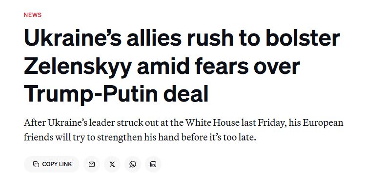 "Европейские союзники Украины спешат укрепить позиции Владимира Зеленского перед возможной встречей Дональда Трампа и Владимира Путина, опасаясь невыгодного для Киева перемирия. На саммите в Брюсселе лидеры ЕС обсуждают трёхуровневый пакет помощи: использование €140 млрд замороженных российских активов, новые санкции и расширение военной поддержки Украины", — пишет издание.