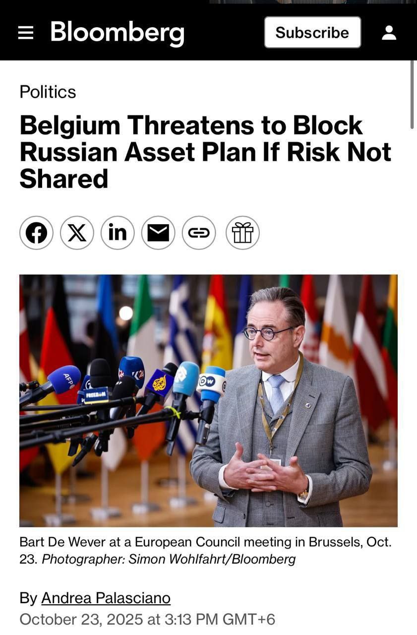 Премьер-министр Бельгии Барт де Вевер заявил, что не поддержит инициативу ЕС по использованию замороженных российских активов, если страны не согласятся разделить риски в случае возможных претензий со стороны Москвы.