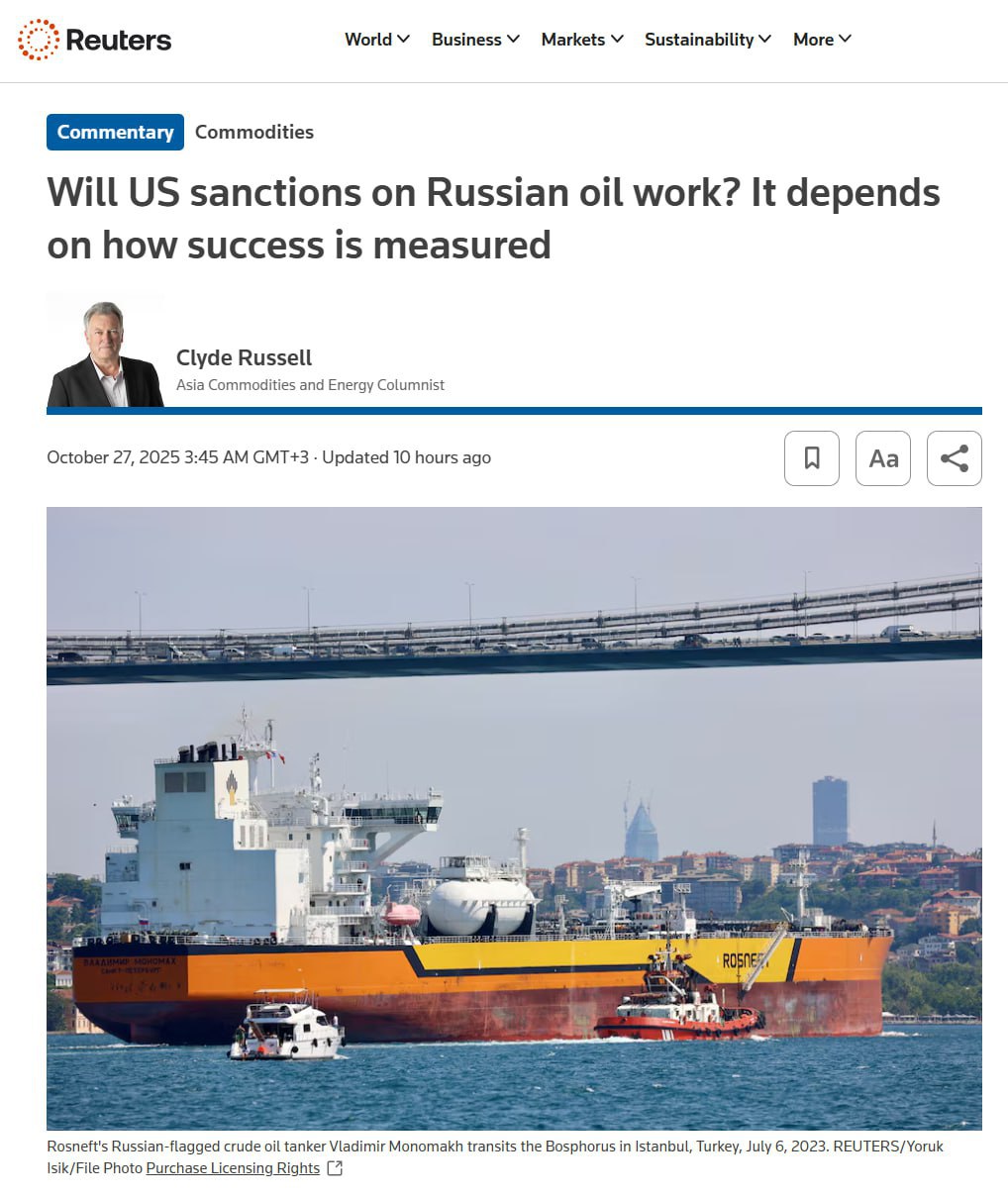 «Означает ли это, что санкции напрасная трата времени? Всё зависит от того, какой цели хотят добиться.Если цель — ограничить экспорт российской нефти, перекрыв поставки Китаю и Индии, то эти меры, скорее всего, окажутся неэффективными.