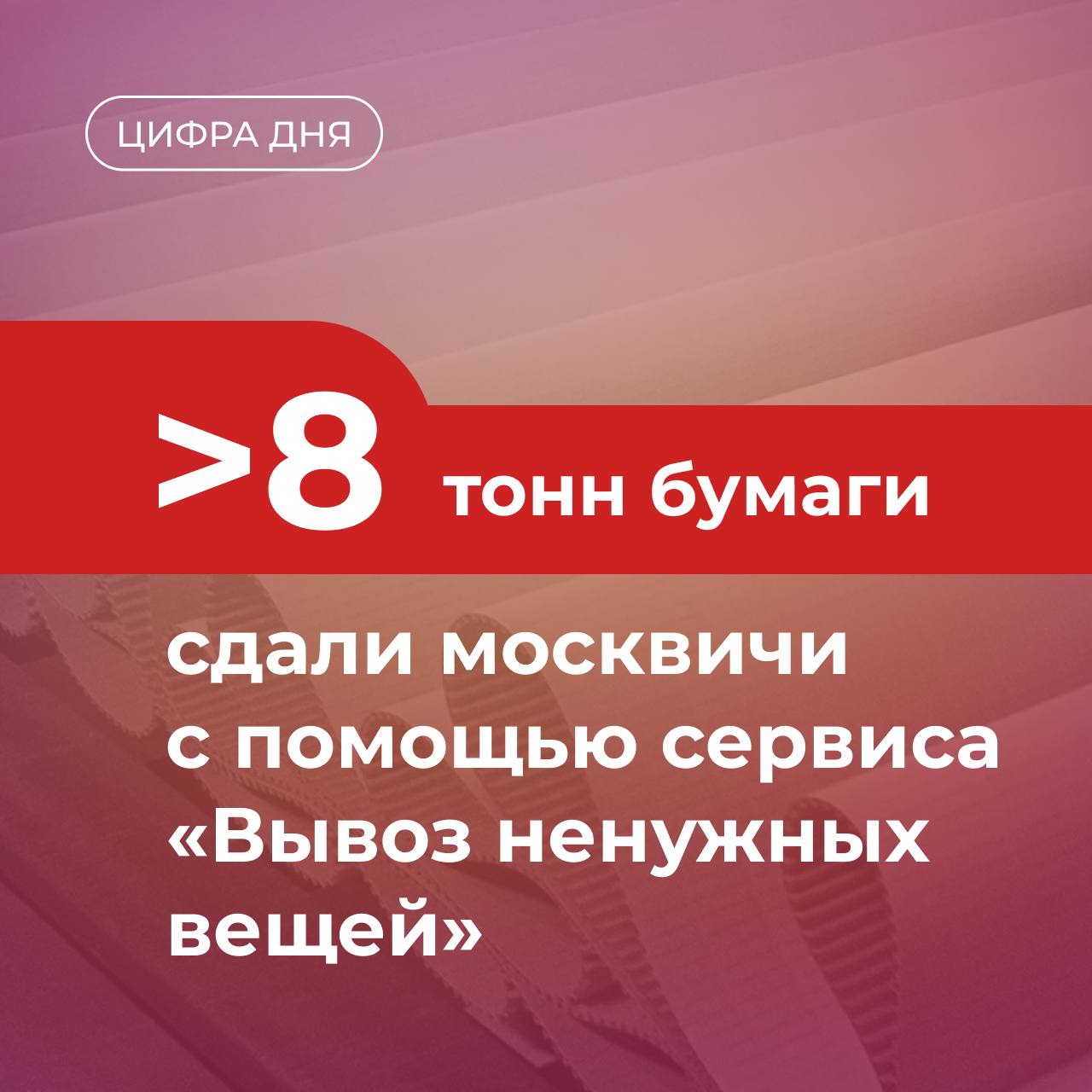 Сервис «Вывоз ненужных вещей» на mos.ruпомог москвичам сдать более 8 тонн бумаги.Чаще всего жители столицы отправляют на переработку большие картонные коробки из-под техники и мебели.