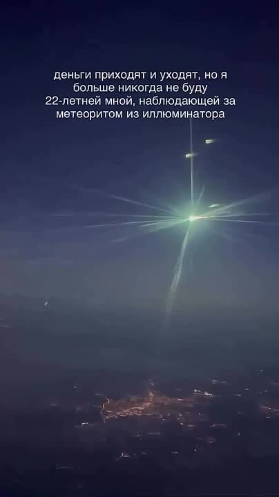 Пролетающий метеорит запечатлела бортпроводница из самолета. Яркий шар стремительно пересекает ночное небо.