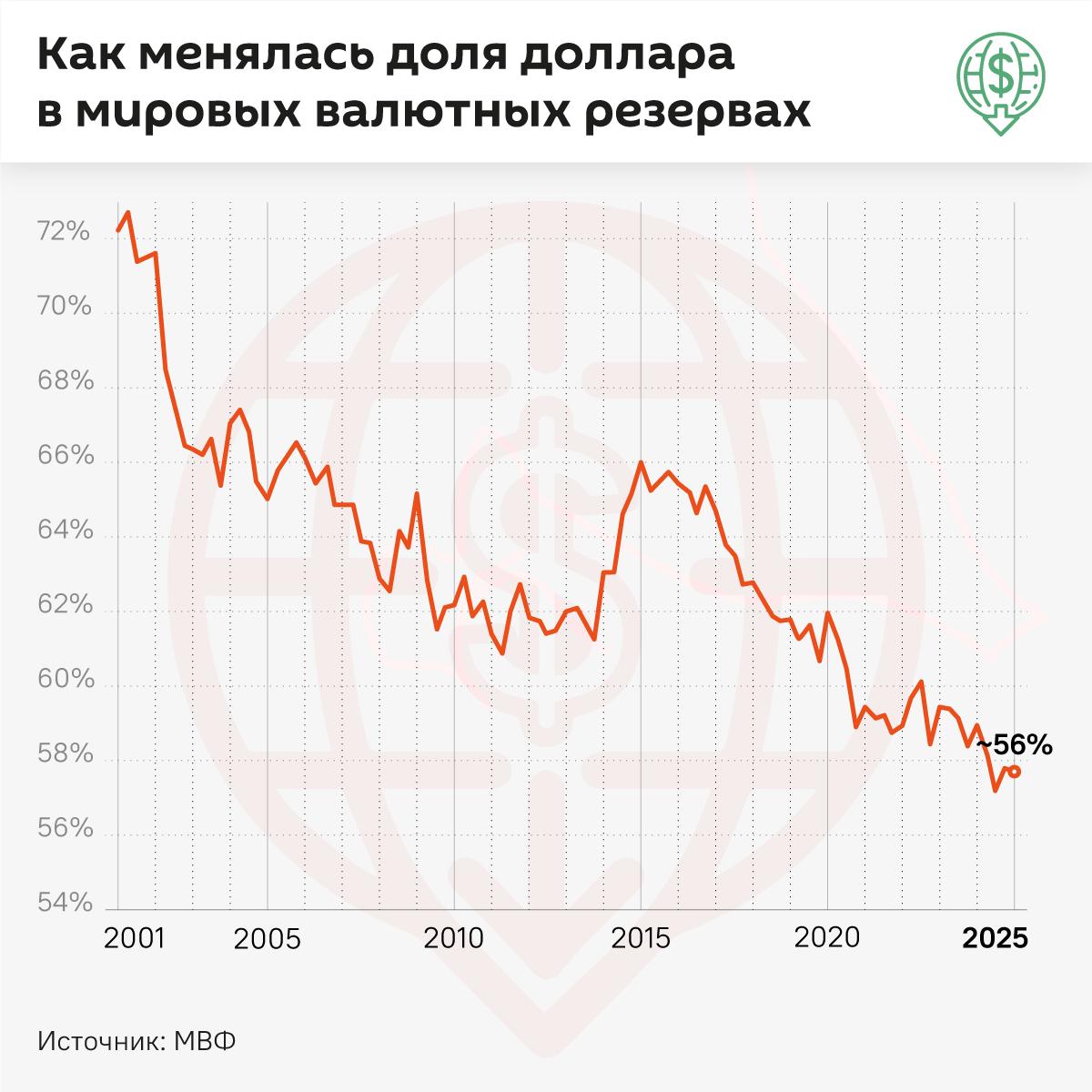 Падение "зеленого змея". С 2001 года доля доллара в мировых валютных резервах упала с ~72% до ~56%.