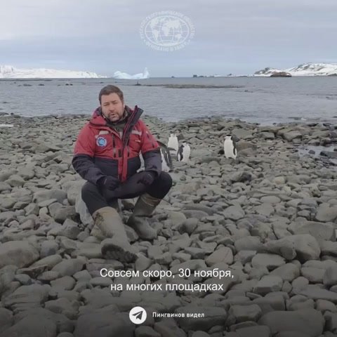 В окружении местных обителей - пингвинов он передает всем подписчикам привет и приглашает присоединиться к Геодиктанту уже в это воскресенье!