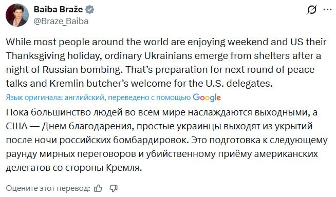 Примечательно, что латвийка сделала акцент на предстоящих переговорах спецпредставителя Трампа Уиткоффа и Владимира Путина в Москве по украинскому урегулированию.