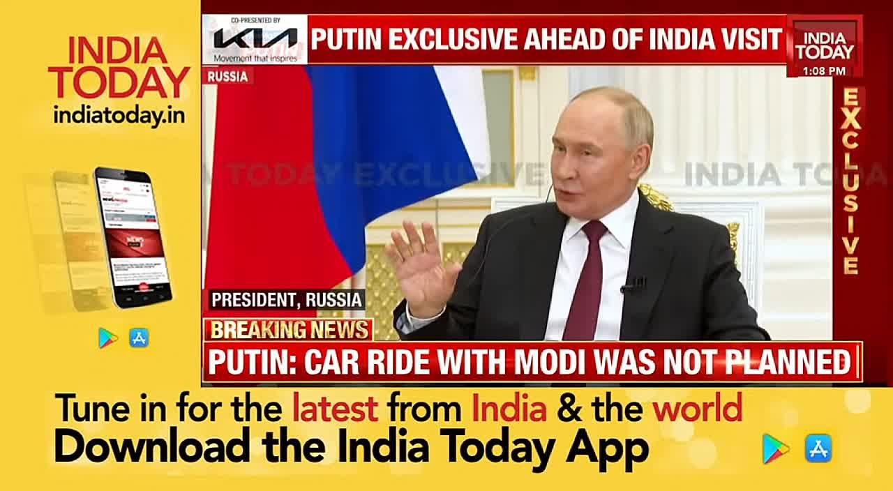 «Надеюсь, что вам нравится в России и в Москве. И Кремль, где мы работаем, тоже нравится. Как видите, всё идёт по плану. В целом мы довольны экономической ситуацией. И что особенно важно — в этом месяце я очень рад, что встречусь, как вы только что отметили, со своим другом, премьер-министром Нарендрой Моди. Мы договорились встретиться в Индии уже давно. Нам есть о чём поговорить, потому что спектр нашего сотрудничества с Индией очень широк. Я уж не говорю об истории наших отношений, потому что эта история имеет уникальный характер. Я также хотел бы отметить путь, который прошла Индия за 77 лет после обретения независимости — а это совсем небольшой срок по масштабам индийской истории — и Индия сумела пройти огромный путь. Я ещё остановлюсь на этом позже, но, знаете, когда мы живём повседневной жизнью, мы редко замечаем происходящие изменения».