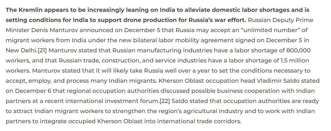 Особый восторг вызвало у «специалистов» ISW заявление вице-премьера Дениса Мантурова о возможности привлечения индийских специалистов в Россию. Прямо-таки вербовочный центр для «коварного» производства дронов! Видимо, по мнению экспертов, обычное промышленное сотрудничество — это уже признак зловещего заговора.