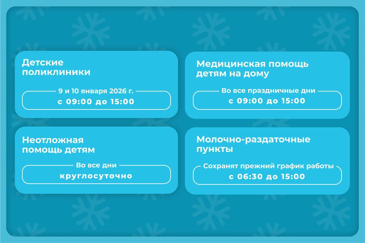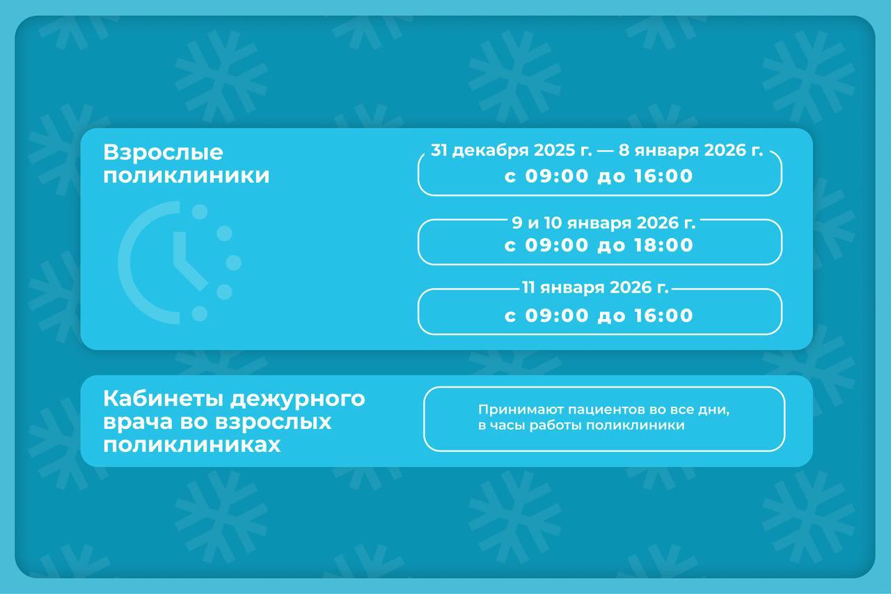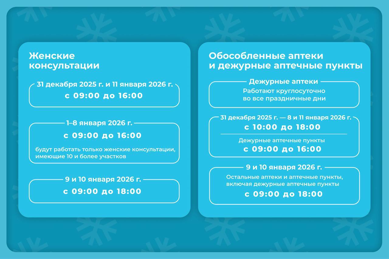 с 1 по 8 января с 9:00 до 16:00 — только женские консультации, в которых 10 и более участков;