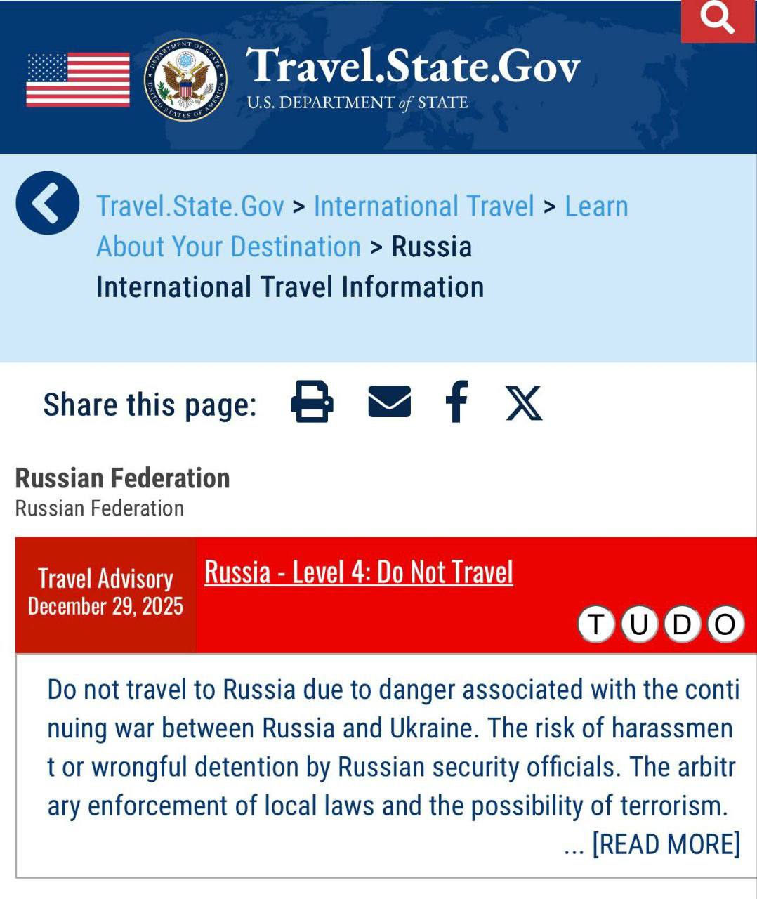 В рекомендации Госдепа указаны риски терроризма, неправомерного задержания и «произвольного применения местных законов». Вашингтон также подчеркнул, что возможности консульской помощи американцам ограничены после сокращения штата посольства в Москве и приостановки работы консульств по всей России.
