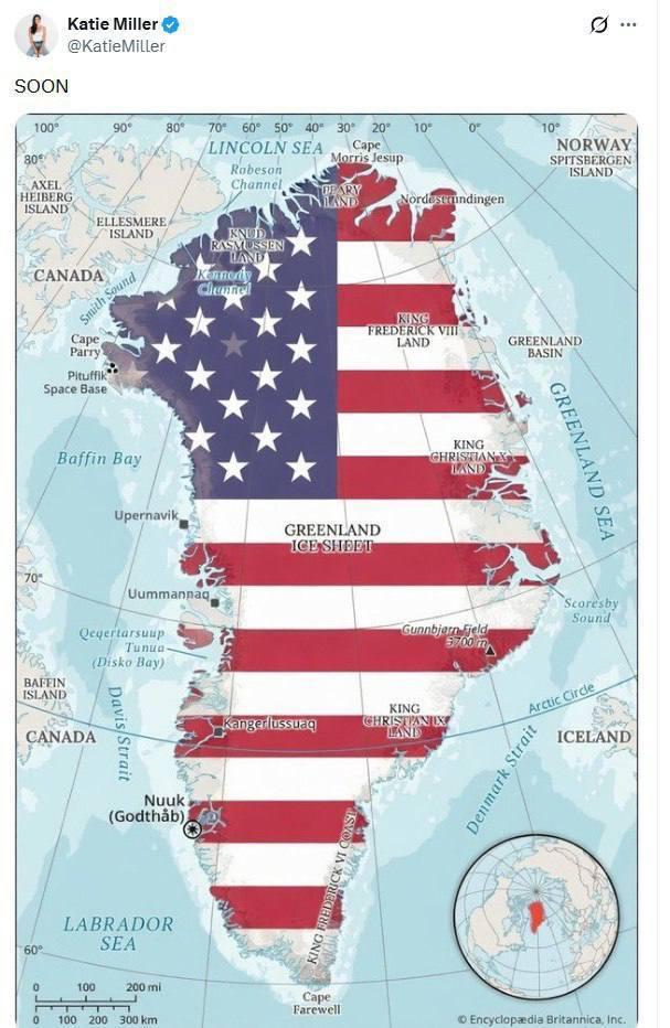 Власти Дании и руководители Гренландии неоднократно заявляли, что остров не станет штатом США. Новый виток обсуждений темы разгорелся сегодня, после того как жена советника Трампа опубликовала карту острова в цветах американского флага с подписью: «Скоро».