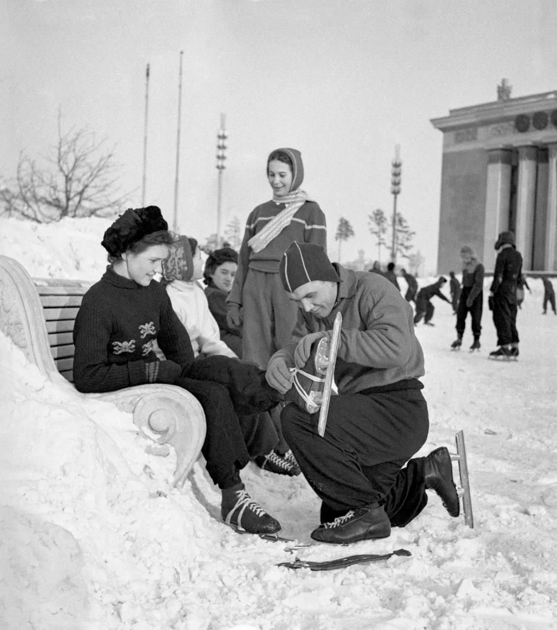 Фотофакт: Учащийся вечерней школы рабочей молодежи Б. Гафуров и студентка МГУ им. В.М. Ломоносова Р. Костина на катке. Москва. Февраль 1955 г. Фото А. Чепрунова. Главархив Москвы