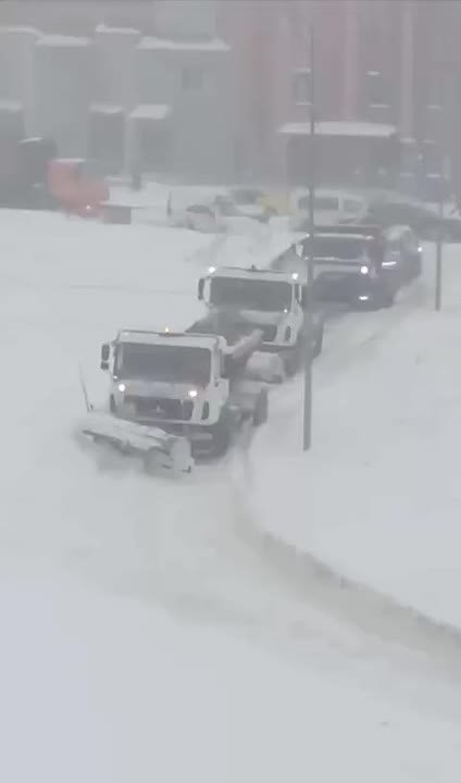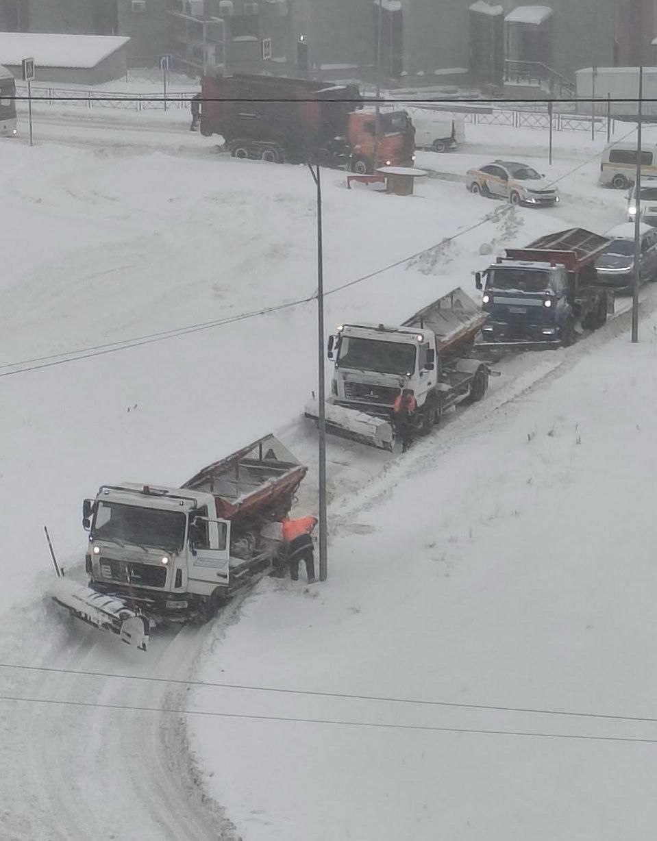 Обстановка в Москве во время рекордного снегопада — автогрейдер увяз в снегу во время уборки дороги