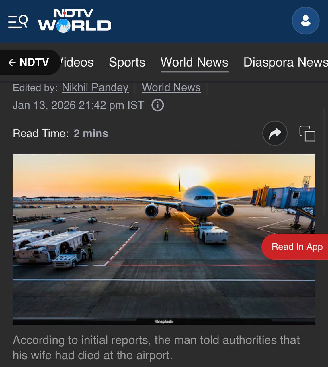 Муж заявил, что его супруга умерла в аэропорту и обвинил в этом службы авиагавани. Полиция его арестовала и начала расследование. Задержанному 80 лет.