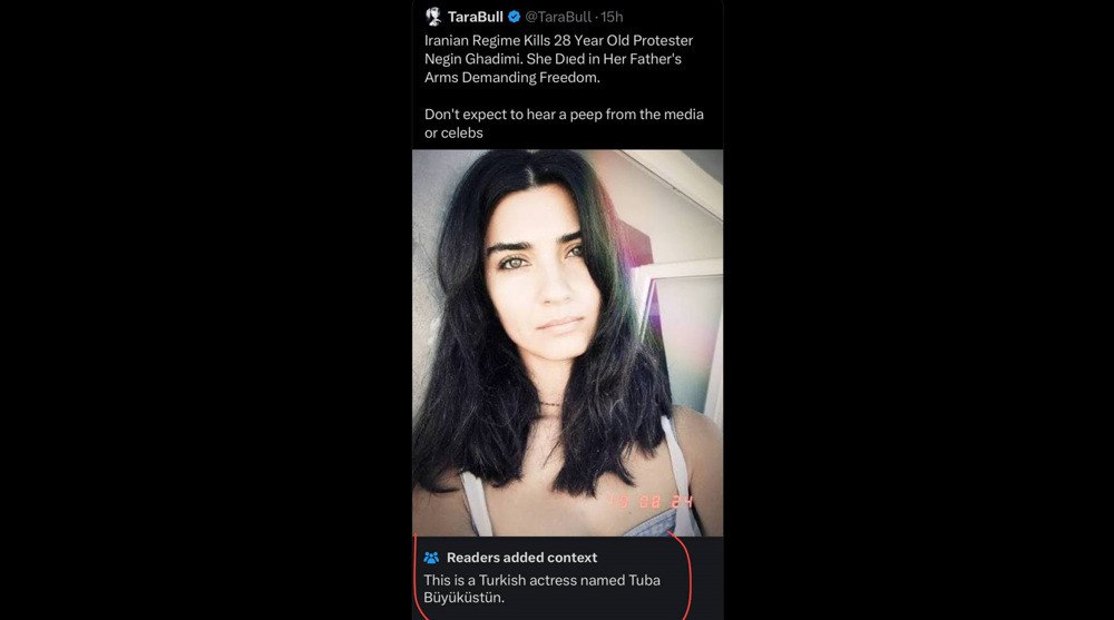 В одном из аккаунтов в социальных сетях, работающем под ником @TaraBull и имеющем синюю галочку подтверждения X, утверждалось, что 28-летняя протестующая Негин Гадими была убита во время беспорядков в Иране «на руках у отца, требуя свободы».