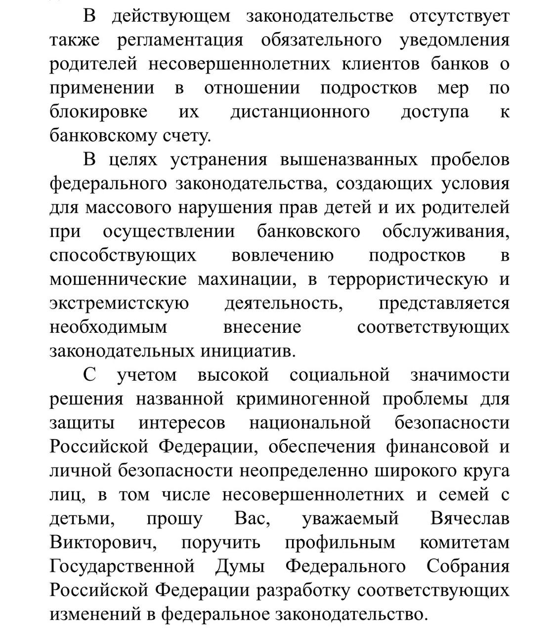 Недавно к нам обратились представители родительской организации из Тамбова: они бьют тревогу из-за отказа банков в предоставлении информации по операциям на картах детей. При замене или утере карты банки просят личного присутствия ребенка в отделении, родителям в этом отказывают. Некоторые из банков вообще навязывают платную услугу по отправке уведомлений по счету ребенка. При этом, за дропперство сейчас установлена уголовная ответственность, а преступники все чаще впутывают в махинации именно детей.