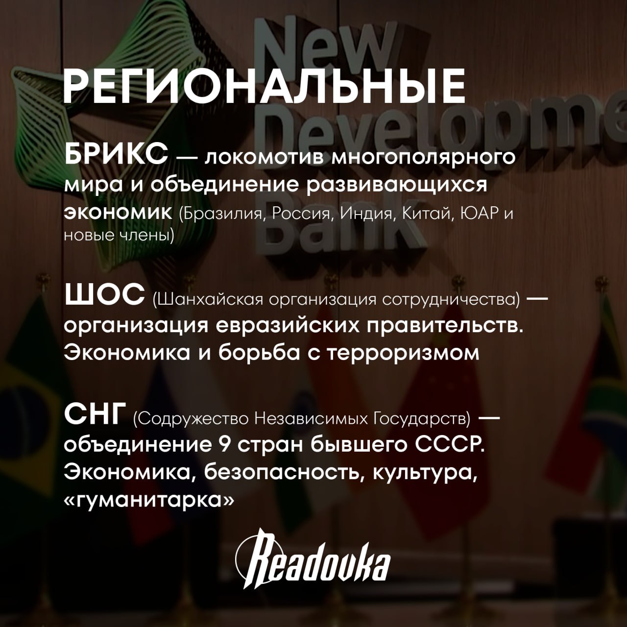 Среди них — ключевые структуры по вопросам безопасности, торговли и стратегического влияния. Readovka собрала главные организации с участием России, чтобы не путаться в аббревиатурах — от экономических блоков до структур, отвечающих за «ядерку».