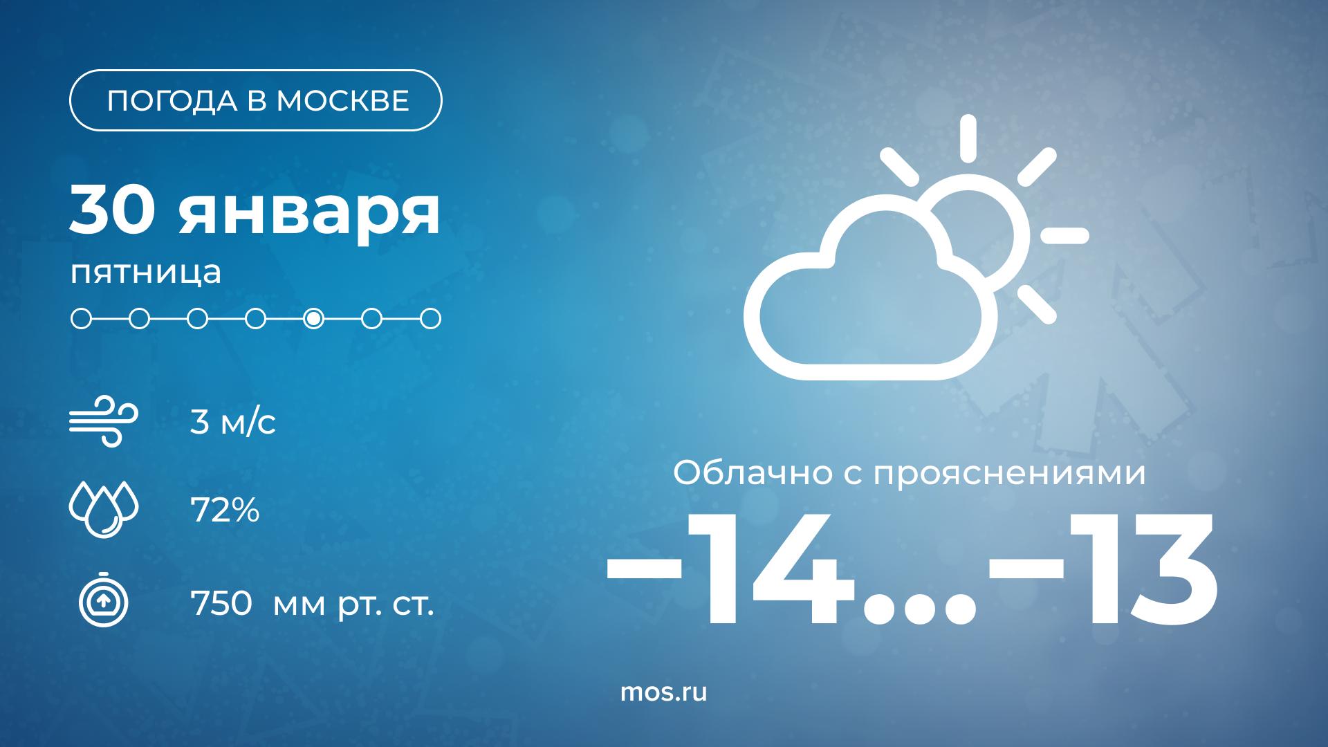 Доброе утро! Сегодня в Москве будет облачно с прояснениями. Столбики термометров днем покажут от 14 до 13 °С. Одевайтесь теплее!