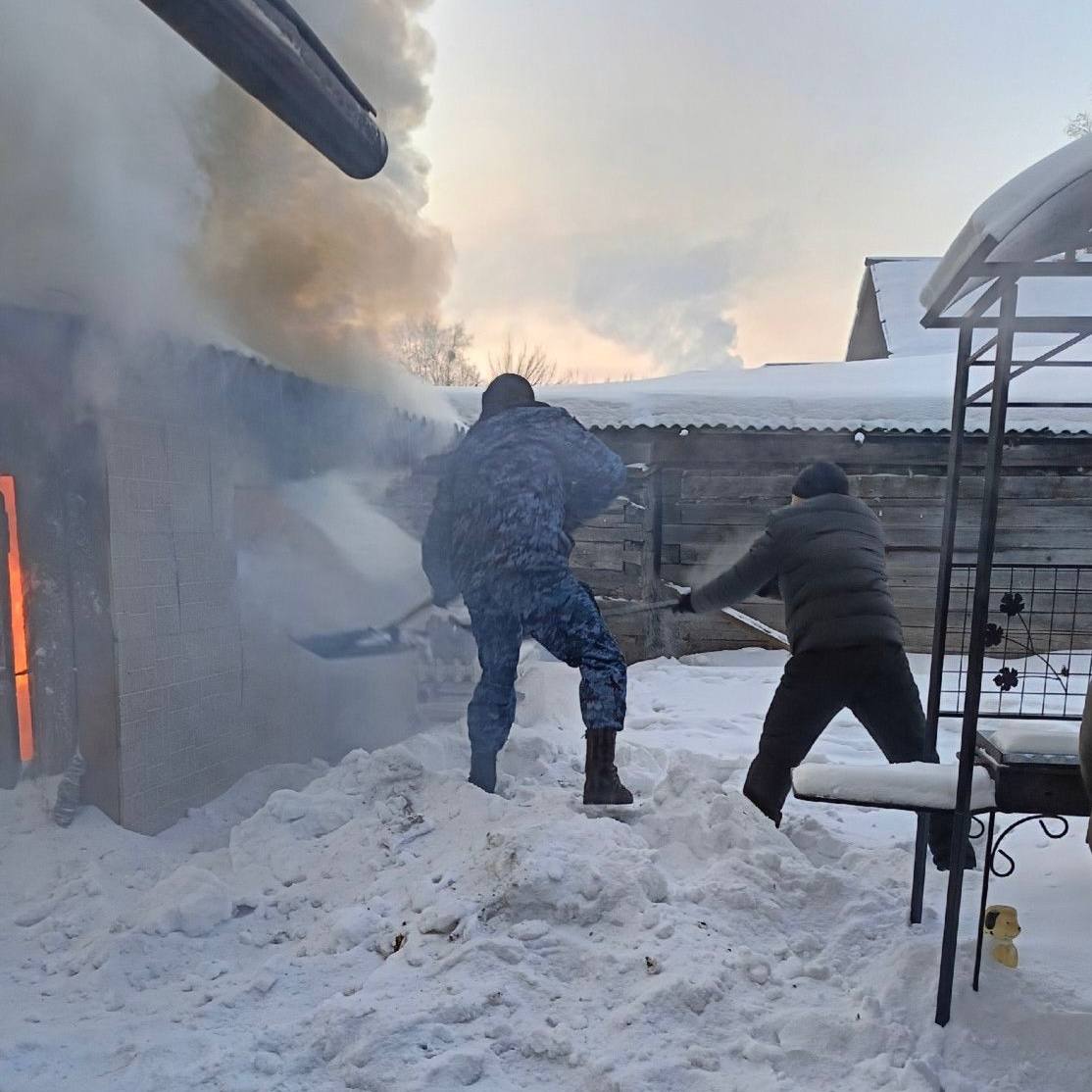 Мужчины вызвали пожарных и вынесли газовый баллон из соседней постройки, чтобы избежать возможного взрыва. До приезда бригады приставы помогали хозяину тушить огонь.