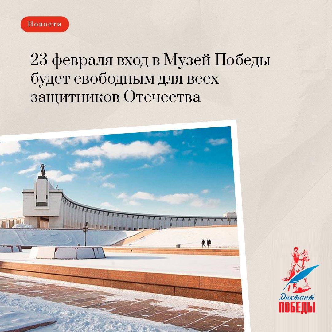 Музей Победы приглашает всех военнослужащих, сотрудников правоохранительных органов, ветеранов боевых действий, участников СВО, курсантов и кадетов посетить музей бесплатно. Исключение составляют экспозиции «Подвиг Народа» и «Битва за Москву. Первая Победа!». Для бесплатного входа необходимо предъявить удостоверение в кассе. Музей будет открыт с 10:00 до 22:00.