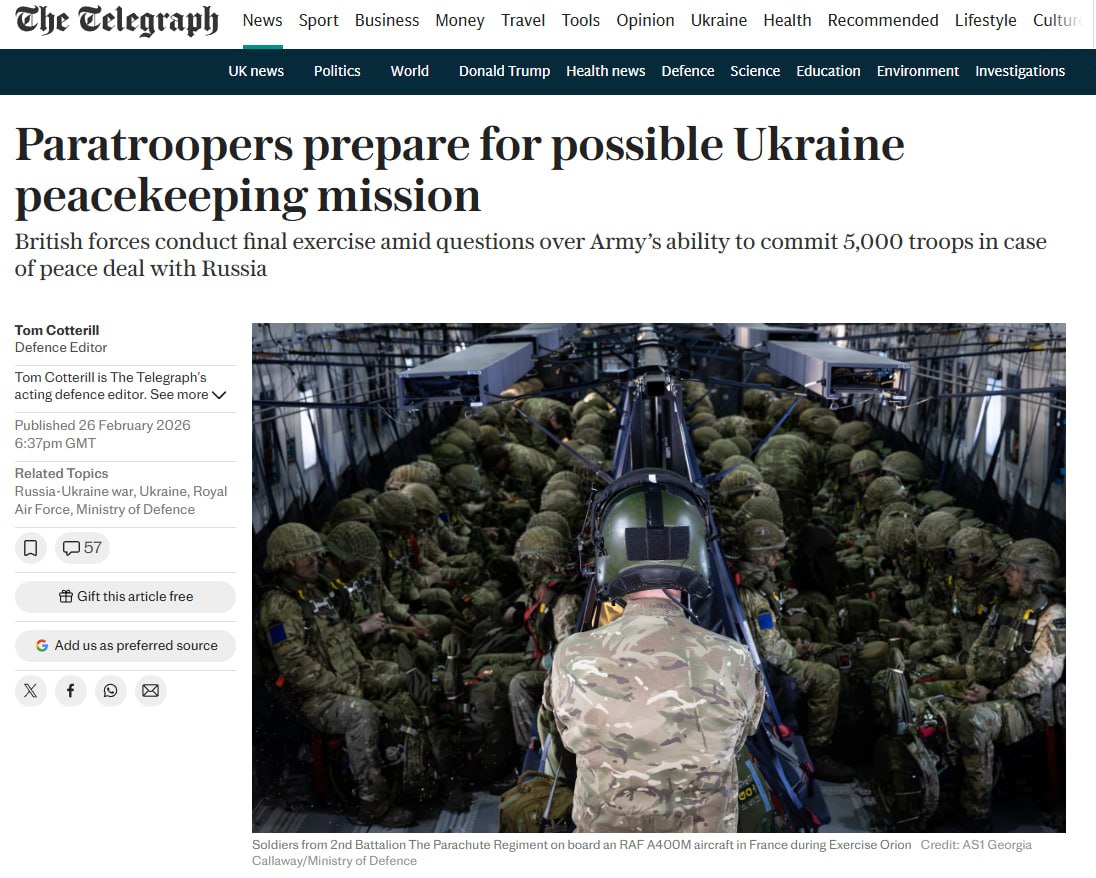 The Telegraph раскрыл детали: более 600 военнослужащих из 16-й воздушно-десантной бригады Британии и французской 11-й воздушно-десантной бригады провели в Бретани учения, имитирующие высадку на Украине. Это финальный этап подготовки к «миротворческой миссии», которую «коалиция желающих» планирует реализовать под флагом гарантий безопасности.