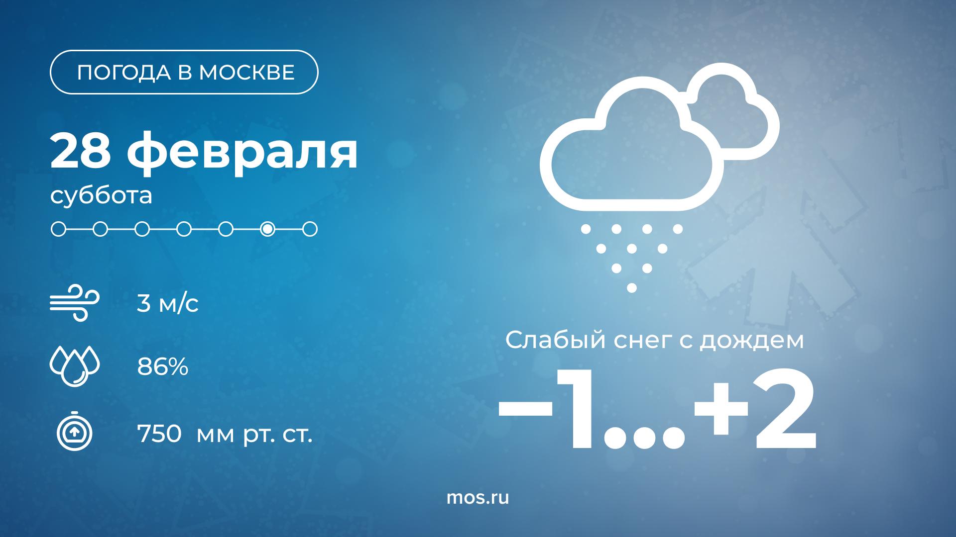 Доброе утро! Сегодня в Москве будет облачно. Днем возможен слабый снег с дождем. Столбики термометров покажут от 1 до +2 °С.