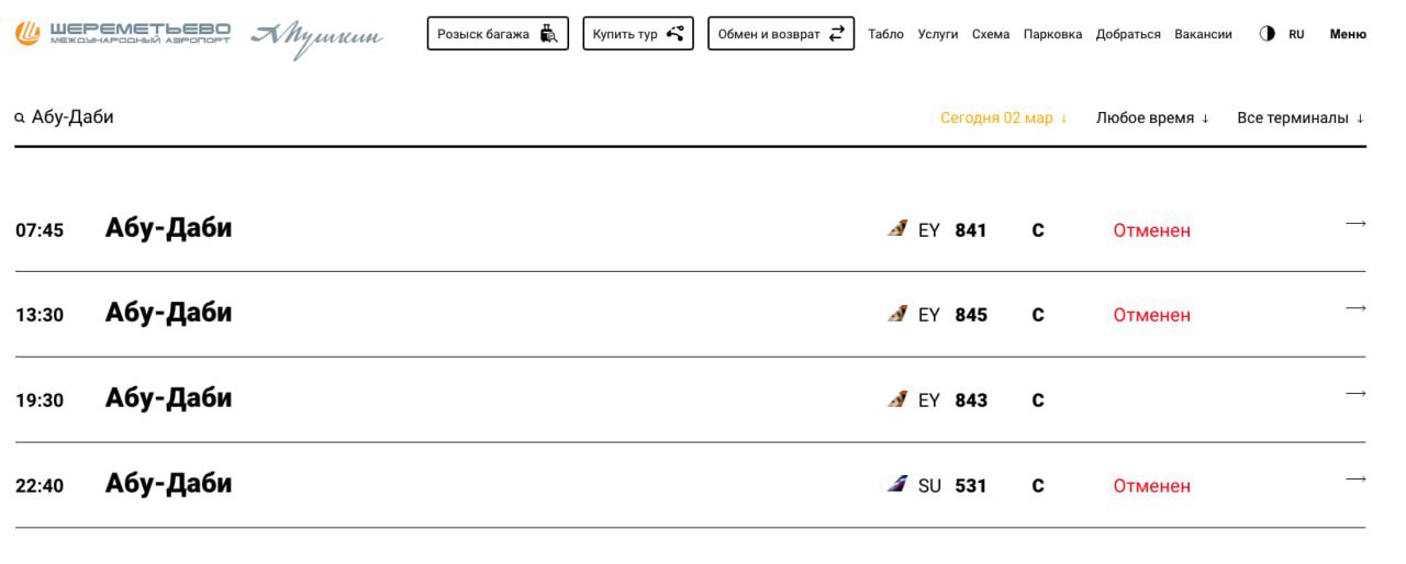 В аэропорту Абу-Даби открыли регистрацию на некоторые рейсы, в том числе в Москву, следует из данных на сайте аэропорта.