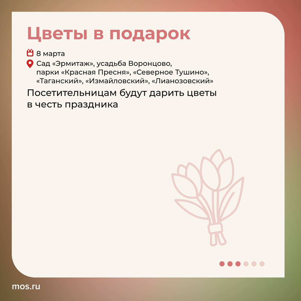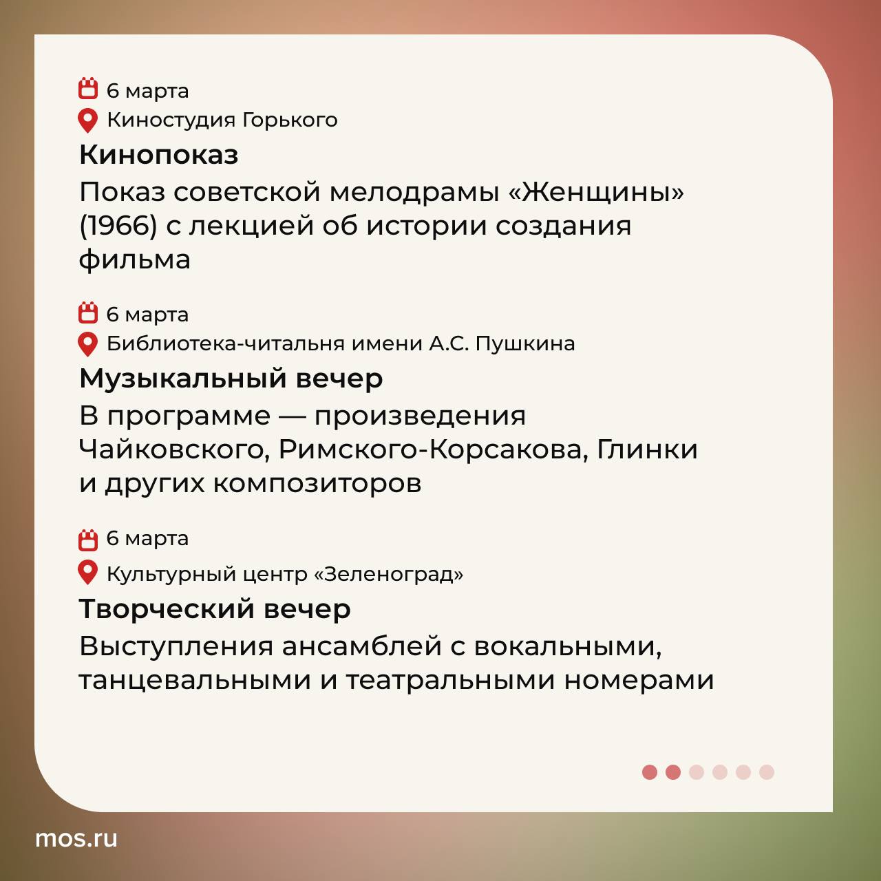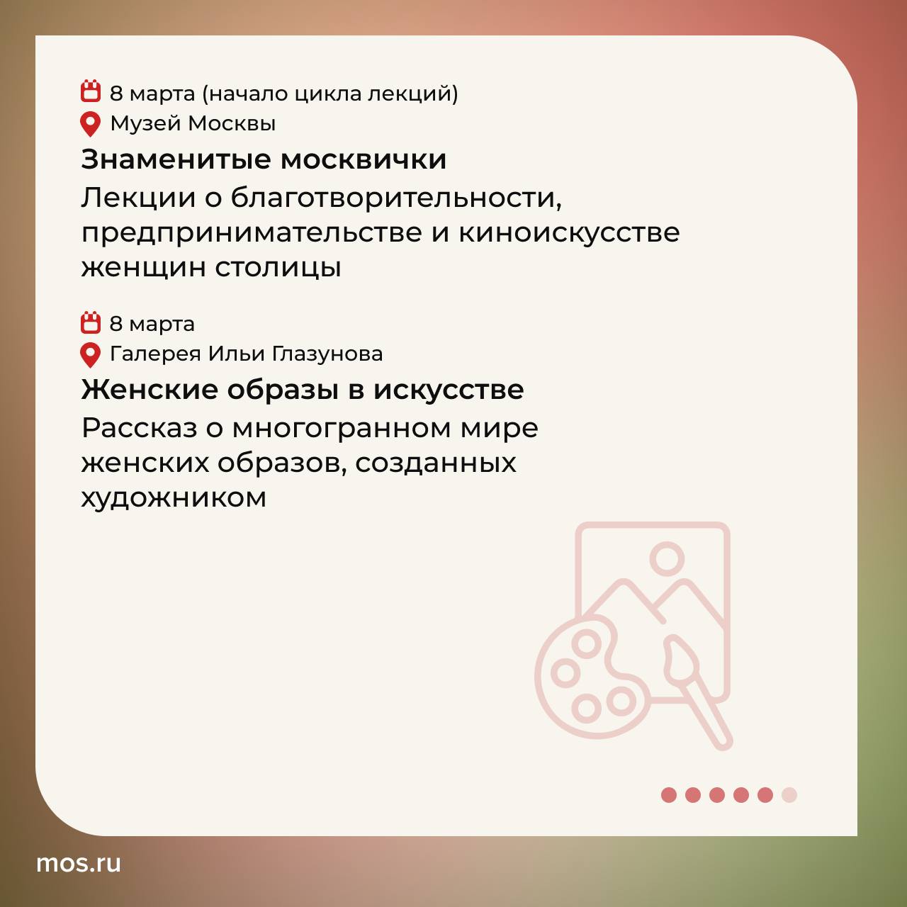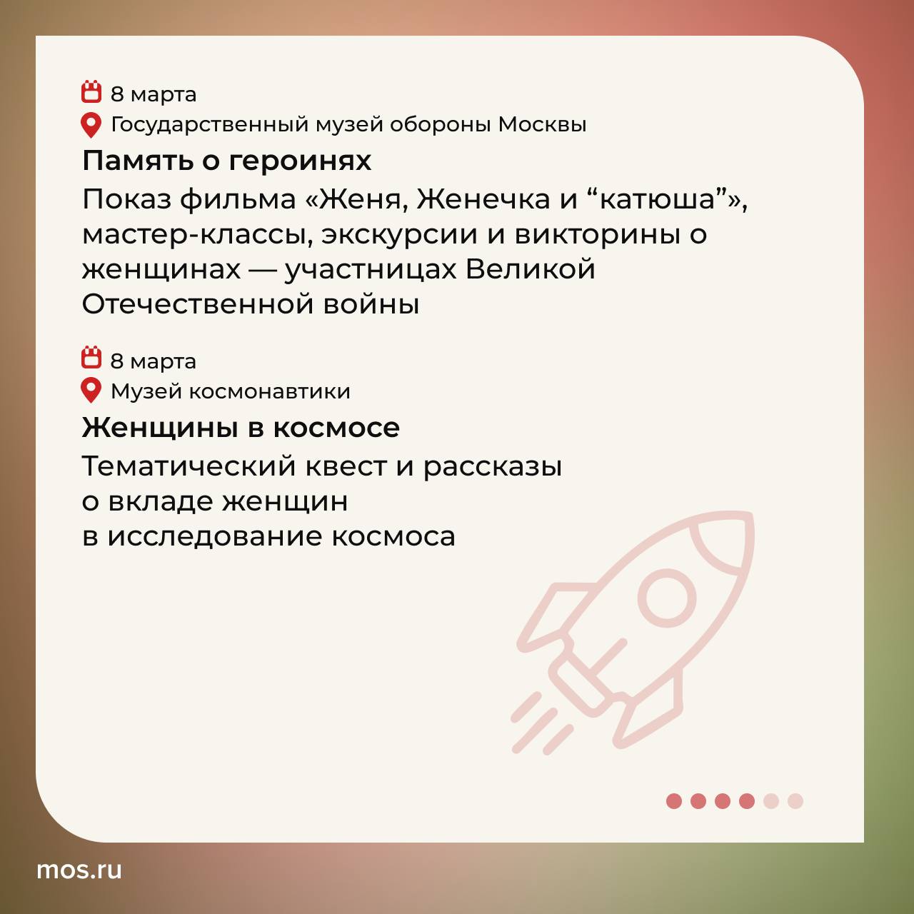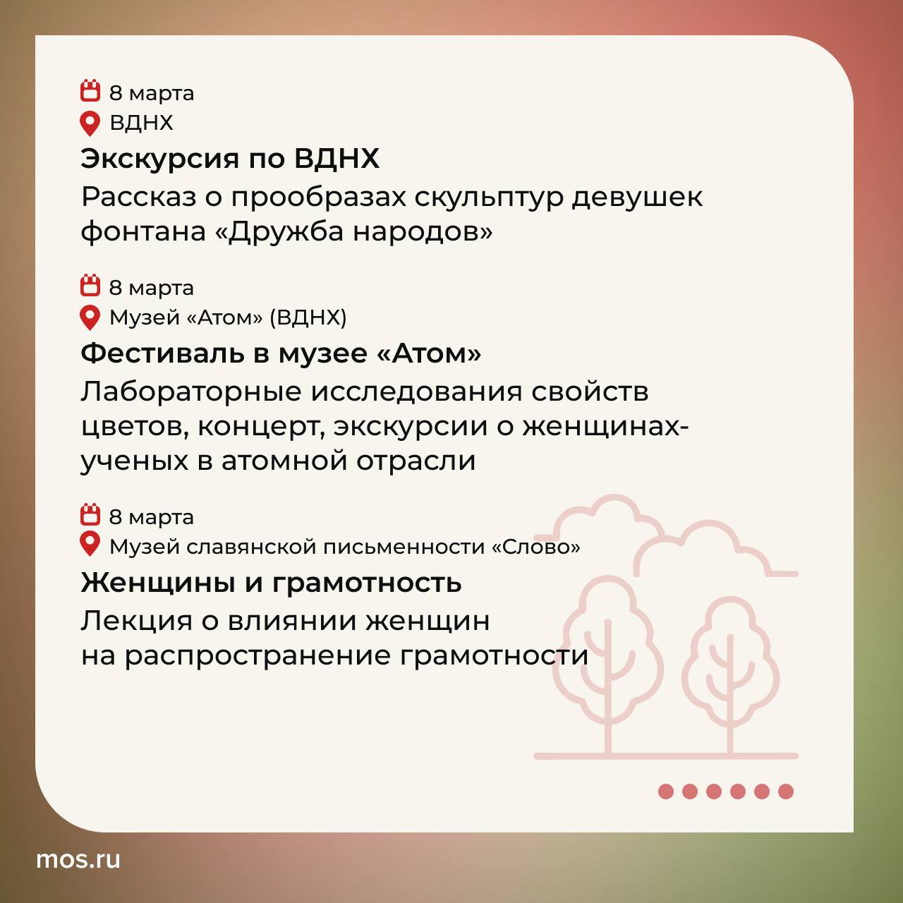 Более 100 столичных учреждений культуры проведут концерты, кинопоказы, экскурсии и мастер-классы в честь Международного женского дня. Гостей ждут лекции о выдающихся женщинах-ученых, тематические квесты и встречи с киноклассикой на больших экранах. Подробности — в нашей подборке.